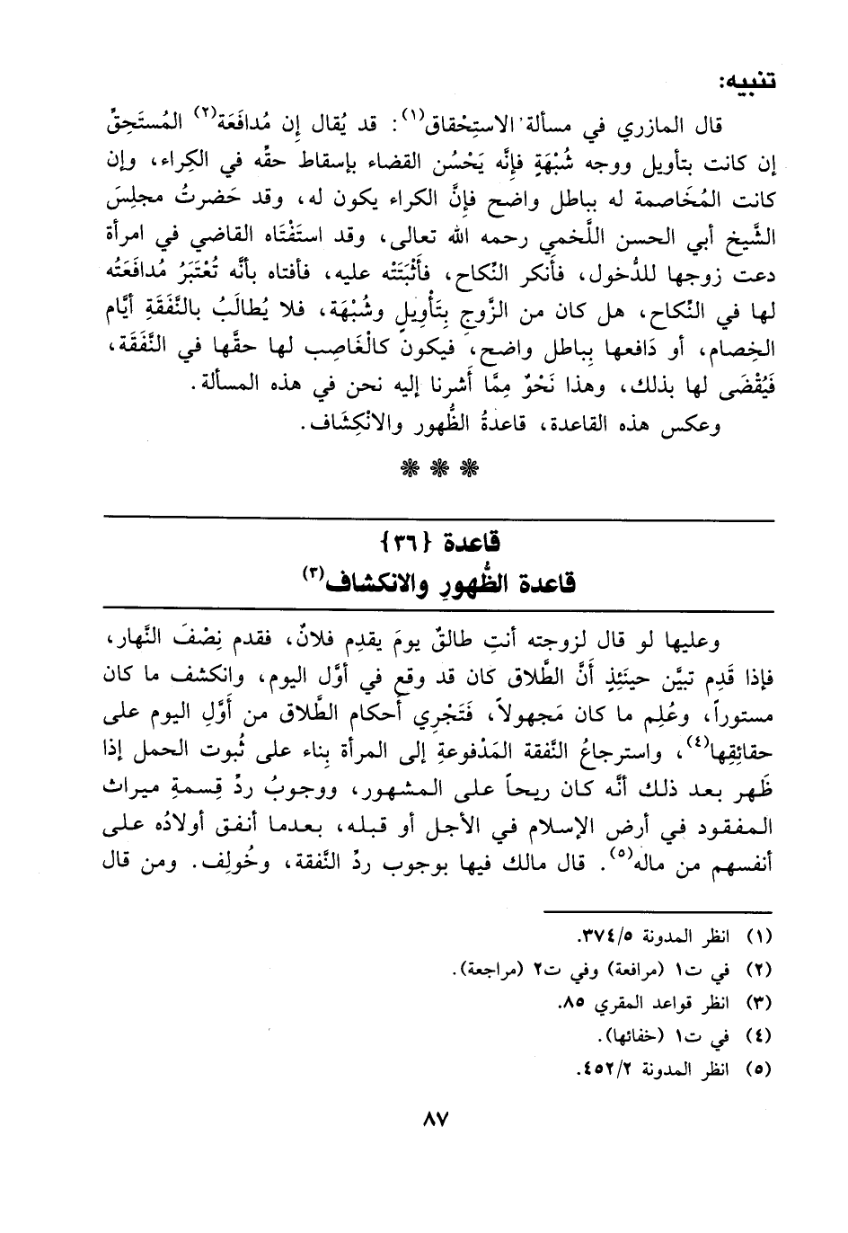 قال المازري في مسألة الاستحقاق: قد يُقال إن مُدافعة المستحق إن كانت بتأويل ووجه شُبهةٍ فإنه يحسن القضاء بإسقاط حقه في الكراء، وإن كانت المُخاصمة له بباطل واضح فإن الكراء يكون له، وقد حضرتُ مجلس الشيخ أبي الحسن اللخمي رحمه الله تعالى، وقد استفتاه القاضي في امرأة دعت زوجها للدخول، فأنكر النكاح، فأثبتته عليه، فأفتاه بأنه تُعتبر مدافعته لها في النكاح، هل كان من الزوج بتأويل وشبهة، فلا يُطالب بالنفقة أيام الخصام، أو دافعها بباطل واضح، فيكون كالغاصب لها حقها في النفقة، فيقضى لها بذلك، وهذا نحو مما أشرنا إليه نحن في هذه المسألة.