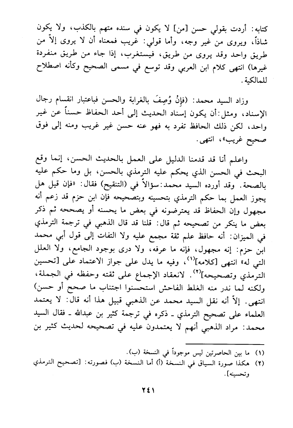 كتابه أردت بقولي حسن من لا يكون في سنده متهم بالكذب ولا يكون شاذا ويروى من غير وجه وأما قولي غريب فمعناه أن لا يروى إلا من طريق واحد وقد يروى من طريق فيستغرب إذا جاء من طريق منفردة غيرها انتهى كلام ابن العربي وقد توسع في مسمى الصحيح وكأنه اصطلاح للمالكية وزاد السيد محمد فإن وصف بالغرابة والحسن فباعتبار انقسام رجال الإسناد ومثل أن يكون إسناد الحديث إلى أحد الحفاظ حسنا عن غير واحد لكن ذلك الحافظ تفرد به فهو عنه حسن غير غريب ومنه إلى فوق صحيح غريب انتهى واعلم أنا قد قدمنا الدليل على العمل بالحديث الحسن إنما وقع البحث في الحسن الذي يحكم عليه الترمذي بالحسن بل وما حكم عليه بالصحة وقد أورده السيد محمد سؤالا في التنقيح فقال فإن قيل هل يجوز العمل بما حكم الترمذي بتحسينه وبتصحيحه فإن ابن حزم قد زعم أنه مجهول وإن الحفاظ قد يعترضونه في بعض ما يحسنه أو يصححه ثم ذكر بعض ما بنكر من تصحيحه ثم قال قلنا قد قال الذهبي في ترجمة الترمذي في الميزان أنه حافظ علم ثقة مجمع عليه ولا التفات إلى قول أبي محمد ابن حزم إنه مجهول فإنه ما عرفه ولا درى بوجود الجامع ولا العلل التي له انتهى كلامه وفيه ما يدل على جواز الاعتماد على تحسين الترمذي وتصحيحه لانعقاد الإجماع على ثقته وحفظه في الجملة ولكنه لما ندر منه الغلط الفاحش استحسنوا اجتناب ما صحح أو حسن انتهى إلا أنه نقل السيد محمد عن الذهبي قبيل هذا أنه قال لا يعتمد العلماء على تصحيح الترمذي ذكره في ترجمة كثير بن عبدالله فقال السيد محمد مراد الذهبي أنهم لا يعتمدون عليه في تصحيحه لحديث كثير بن
