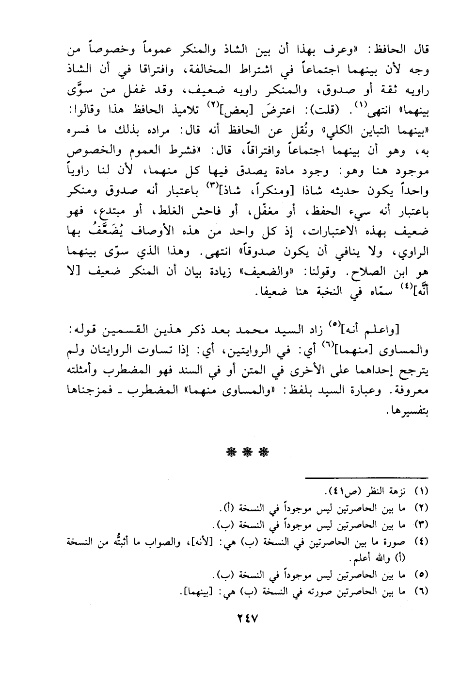 قال الحافظ وعرف بهذا أن بين الشاذ والمنكر عموما وخصوصا من وجه لأن بينهما اجتماعا في اشتراط المخالفة وافتراقا في أن الشاذ راويه ثقة أو صدوق والمنكر راويه ضعيف وقد غفل من سوى بينهما انتهى قلت اعترض بعض تلاميذ الحافظ هذا وقالوا بينهما التباين الكلي ونقل عن الحافظ أنه قال مراده بذلك ما فسره به وهو أن بينهما اجتماعا وافتراقا قال فشرط العموم والخصوص موجود هنا وهو وجود مادة يصدق فيها كل منهما لأن لنا راويا واحدا يكون حديثه شاذا ومنكرا شاذ باعتبار أنه صدوق ومنكر باعتبار أنه سيء الحفظ أو مغفل أو فاحش الغلط أو مبتدع فهو ضعيف بهذه الاعتبارات إذ كل واحد من هذه الأوصاف يضعف بها الراوي ولا ينافي أن يكون صدوقا انتهى وهذا الذي سوى بينهما هو ابن الصلاح وقولنا والضعيف زيادة بيان أن المنكر ضعيف لا أنه سماه في النخبة هنا ضعيفا واعلم أنه زاد السيد محمد بعد ذكر هذين القسمين قوله والمساوي منهما أي في الروايتين أي إذا تساوت الروايتان ولم يترجح إحداهما على الأخرى في المتن أو في السند فهو المضطرب وأمثلته معروفة وعبارة السيد بلفظ والمساوي منهما المضطرب فمزجناها بتفسيرها
