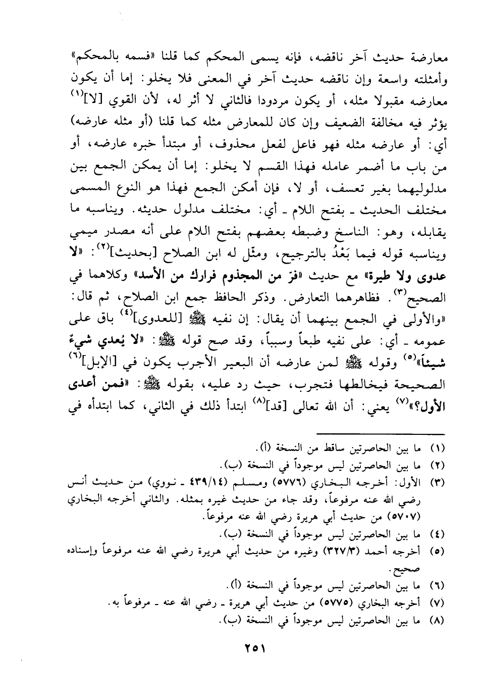 معارضة حديث آخر ناقضه فإنه يسمى المحكم كما قلنا فسمه بالمحكم وأمثلته واسعة وإن ناقضه حديث آخر في المعنى فلا يخلو إما أن يكون معارضه مقبولا مثله أو يكون مردودا فالثاني لا أثر له لأن القوي لا يؤثر فيه مخالفة الضعيف وإن كان للمعارض مثله كما قلنا أو مثله عارضه أي أو عارضه مثله فهو فاعل لفعل محذوف أو مبتدأ خبره عارضه أو من باب ما أضمر عامله فهذا القسم لا يخلو إما أن يمكن الجمع بين مدلوليهما بغير تعسف أو لا فإن أمكن الجمع فهذا هو النوع المسمى مختلف الحديث بفتح اللام أي مختلف مدلول حديثه ويناسبه ما يقابله وهو الناسخ وضبطه بعضهم بفتح اللام على أنه مصدر ميمي ويناسبه قوله فيما بعد بالترجيح ومثل له ابن الصلاح بحديث لا عدوى ولا طيرة مع حديث فر من المجذوم فرارك من الأسد وكلاهما في الصحيح فظاهرهما التعارض وذكر الحافظ جمع ابن الصلاح ثم قال والأولى في الجمع بينهما أن يقال إن نفيه صلى الله عليه وسلم للعدوى باق على عمومه أي على نفيه طبعا وسببا وقد صح قوله صلى الله عليه وسلم لا يعدي شيء شيئا وقوله صلى الله عليه وسلم لمن عارضه أن البعير الأجرب يكون في الإبل الصحيحة فيخالطها فتجرب حيث رد عليه بقوله صلى الله عليه وسلم فمن أعدى الأول يعني أن الله تعالى قد ابتدأ ذلك في الثاني كما ابتدأه في