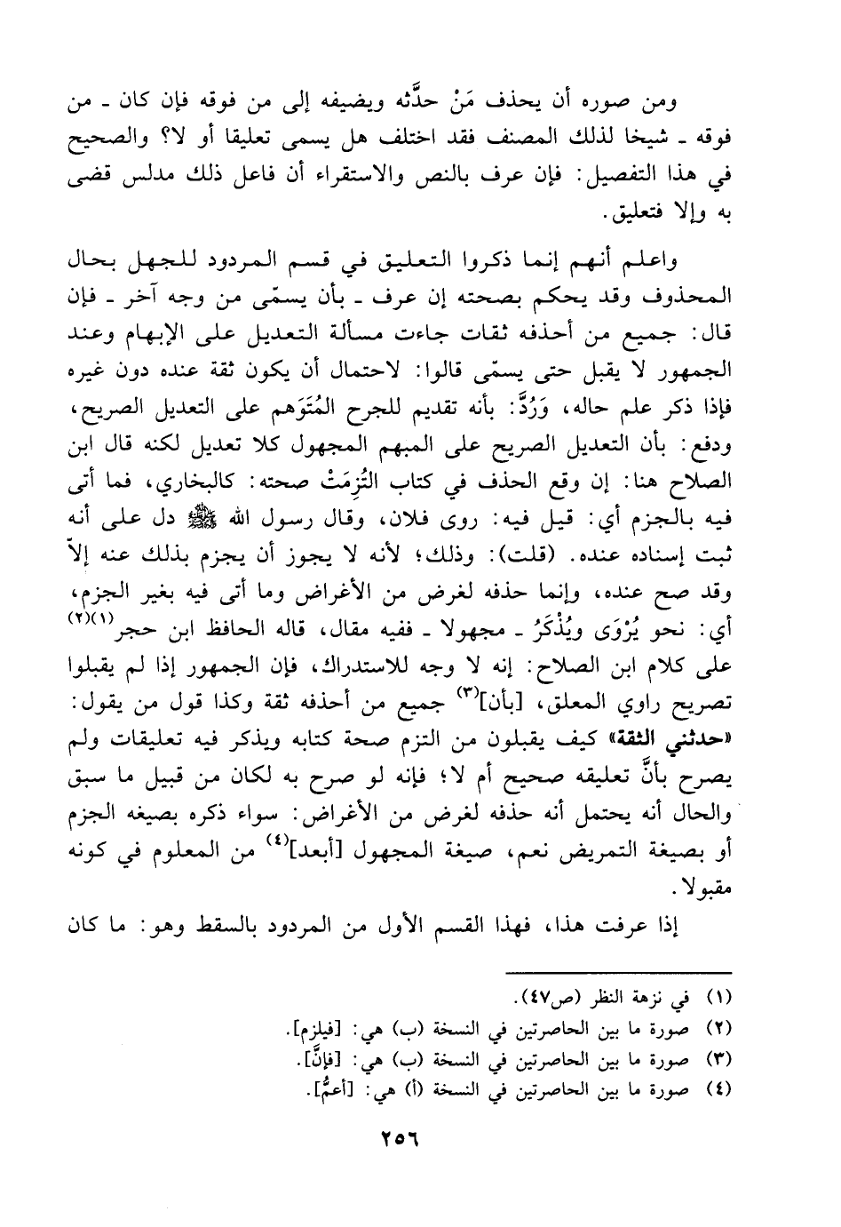 ومن صوره أن يحذف من حدثه ويضيفه إلى من فوقه فإن كان من فوقه شيخا لذلك المصنف فقد اختلف هل يسمى تعليقا أو لا والصحيح في هذا التفصيل فإن عرف بالنص والاستقراء أن فاعل ذلك مدلس قضى به وإلا فتعليق واعلم أنهم إنما ذكروا التعليق في قسم المردود للجهل بحال المحذوف وقد يحكم بصحته إن عرف بأن يسمى من وجه آخر فإن قال جميع من أحذفه ثقات جاءت مسألة التعديل على الإبهام وعند الجمهور لا يقبل حتى يسمى قالوا لاحتمال أن يكون ثقة عنده دون غيره فإذا ذكر علم حاله ورد بأنه تقديم للجرح المتوهم على التعديل الصريح ودفع بأن التعديل الصريح على المبهم المجهول كلا تعديل لكنه قال ابن الصلاح هنا إن وقع الحذف في كتاب التزمت صحته كالبخاري فما أتى فيه بالجزم أي قيل فيه روى فلان وقال رسول الله صلى الله عليه وسلم دل على أنه ثبت إسناده عنده قلت وذلك لأنه لا يجوز أن يجزم بذلك عنه إلا وقد صح عنده وإنما حذفه لغرض من الأغراض وما أتى فيه بغير الجزم أي نحو يروى ويذكر مجهولا ففيه مقال قاله الحافظ ابن حجر على كلام ابن الصلاح إنه لا وجه للاستدراك فإن الجمهور إذا لم يقبلوا تصريح راوي المعلق بأن جميع من أحذفه ثقة وكذا قول من يقول حدثني الثقة كيف يقبلون من التزم صحة كتابه ويذكر فيه تعليقات ولم يصرح بأن تعليقه صحيح أم لا فإنه لو صرح به لكان من قبيل ما سبق والحال أنه يحتمل أنه حذفه لغرض من الأغراض سواء ذكره بصيغه الجزم أو بصيغة التمريض نعم صيغة المجهول أبعد من المعلوم في كونه مقبولا إذا عرفت هذا فهذا القسم الأول من المردود بالسقط وهو ما كان
