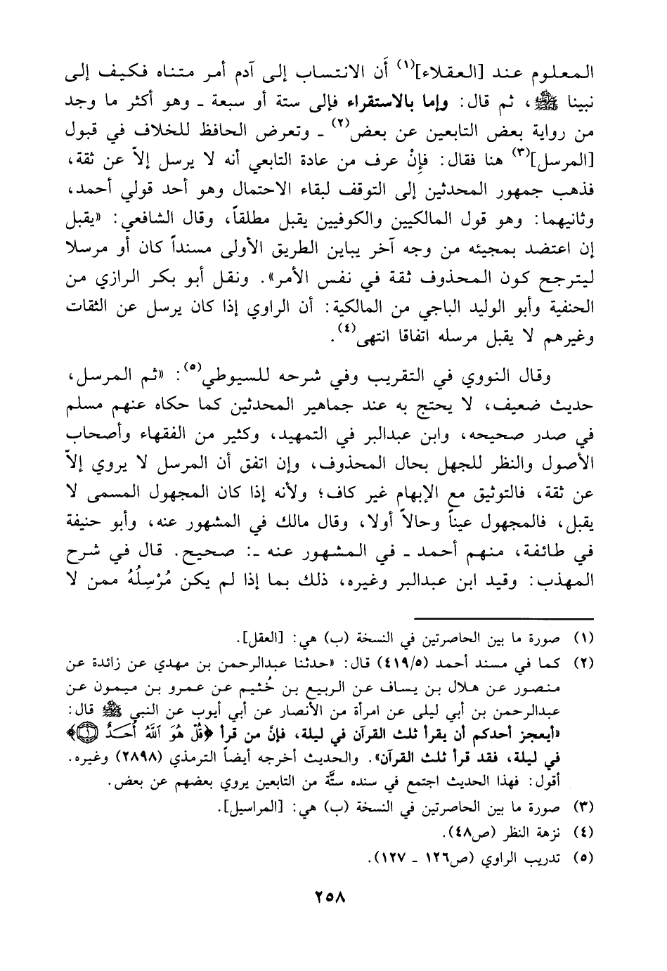 المعلوم عند العقلاء أن الانتساب إلى آدم أمر متناه فكيف إلى نبينا صلى الله عليه وسلم ثم قال وإما بالاستقراء فإلى ستة أو سبعة وهو أكثر ما وجد من رواية بعض التابعين عن بعض وتعرض الحافظ للخلاف في قبول المرسل هنا فقال فإن عرف من عادة التابعي أنه لا يرسل إلا عن ثقة فذهب جمهور المحدثين إلى التوقف لبقاء الاحتمال وهو أحد قولي أحمد وثانيهما وهو قول المالكيين والكوفيين يقبل مطلقا وقال الشافعي يقبل إن اعتضد بمجيئه من وجه آخر يباين الطريق الأولى مسندا كان أو مرسلا ليترجح كون المحذوف ثقة في نفس الأمر ونقل أبو بكر الرازي من الحنفية وأبو الوليد الباجي من المالكية أن الراوي إذا كان يرسل عن الثقات وغيرهم لا يقبل مرسله اتفاقا انتهى وقال النووي في التقريب وفي شرحه للسيوطي ثم المرسل حديث ضعيف لا يحتج به عند جماهير المحدثين كما حكاه عنهم مسلم في صدر صحيحه وابن عبدالبر في التمهيد وكثير من الفقهاء وأصحاب الأصول والنظر للجهل بحال المحذوف وإن اتفق أن المرسل لا يروي إلا عن ثقة فالتوثيق مع الإبهام غير كاف ولأنه إذا كان المجهول المسمى لا يقبل فالمجهول عينا وحالا أولا وقال مالك في المشهور عنه وأبو حنيفة في طائفة منهم