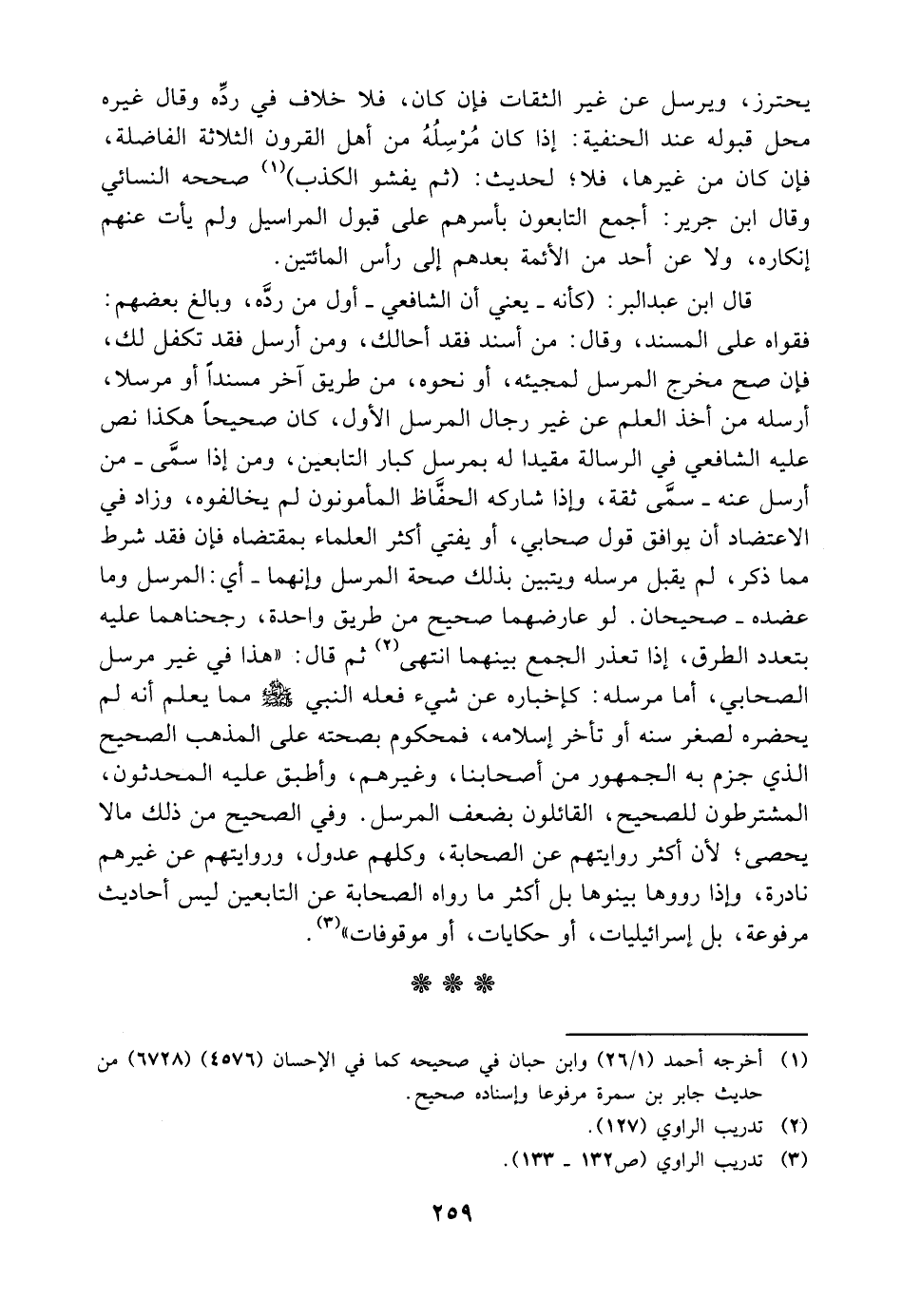 يحترز ويرسل عن غير الثقات فإن كان فلا خلاف في رده وقال غيره محل قبوله عند الحنفية إذا كان مرسله من أهل القرون الثلاثة الفاضلة فإن كان من غيرها فلا لحديث ثم يفشو الكذب صححه النسائي وقال ابن جرير اجمع التابعون بأسرهم على قبول المراسيل ولم يأت عنهم إنكاره ولا عن أحد من الأئمة بعدهم إلى رأس المائتين قال ابن عبدالبر كأنه يعني أن الشافعي أول من رده وبالغ بعضهم فقواه على المسند وقال من أسند فقد أحالك ومن أرسل فقد تكفل لك فإن صح مخرج المرسل لمجيئه أو نحوه من طريق آخر مسندا أو مرسلا أرسله من أخذ العلم عن غير رجال المرسل الأول كان صحيحا هكذا نص عليه الشافعي في الرسالة مقيدا له بمرسل كبار التابعين ومن إذا سمى من أرسل عنه سمى ثقة وإذا شاركه الحفاظ المأمونون لم يخالفوه وزاد في الاعتضاد أن يوافق قول صحابي أو يفتي أكثر العلماء بمقتضاه فإن فقد شرط مما ذكر لم يقبل مرسله ويتبين بذلك صحة المرسل وإنهما أي المرسل وما عضده صحيحان لو عارضهما صحيح من طريق واحدة رجحناهما عليه بتعدد الطرق إذا تعذر الجمع بينهما انتهى ثم قال هذا في غير مرسل الصحابي أما مرسله كإخباره عن شيء فعله النبي صلى الله عليه وسلم مما يعلم أنه لم يحضره لصغر سنه أو تأخر إسلامه فمحكوم بصحته على المذهب الصحيح الذي جزم به الجمهور من أصحابنا وغيرهم وأطبق عليه المحدثون المشترطون للصحيح القائلون بضعف المرسل وفي الصحيح من ذلك مالا يحصى لأن أكثر روايتهم عن الصحابة وكلهم عدول وروايتهم عن غيرهم نادرة وإذا رووها بينوها بل أكثر ما رواه الصحابة عن التابعين ليس أحاديث مرفوعة بل إسرائيليات أو حكايات أو موقوفات