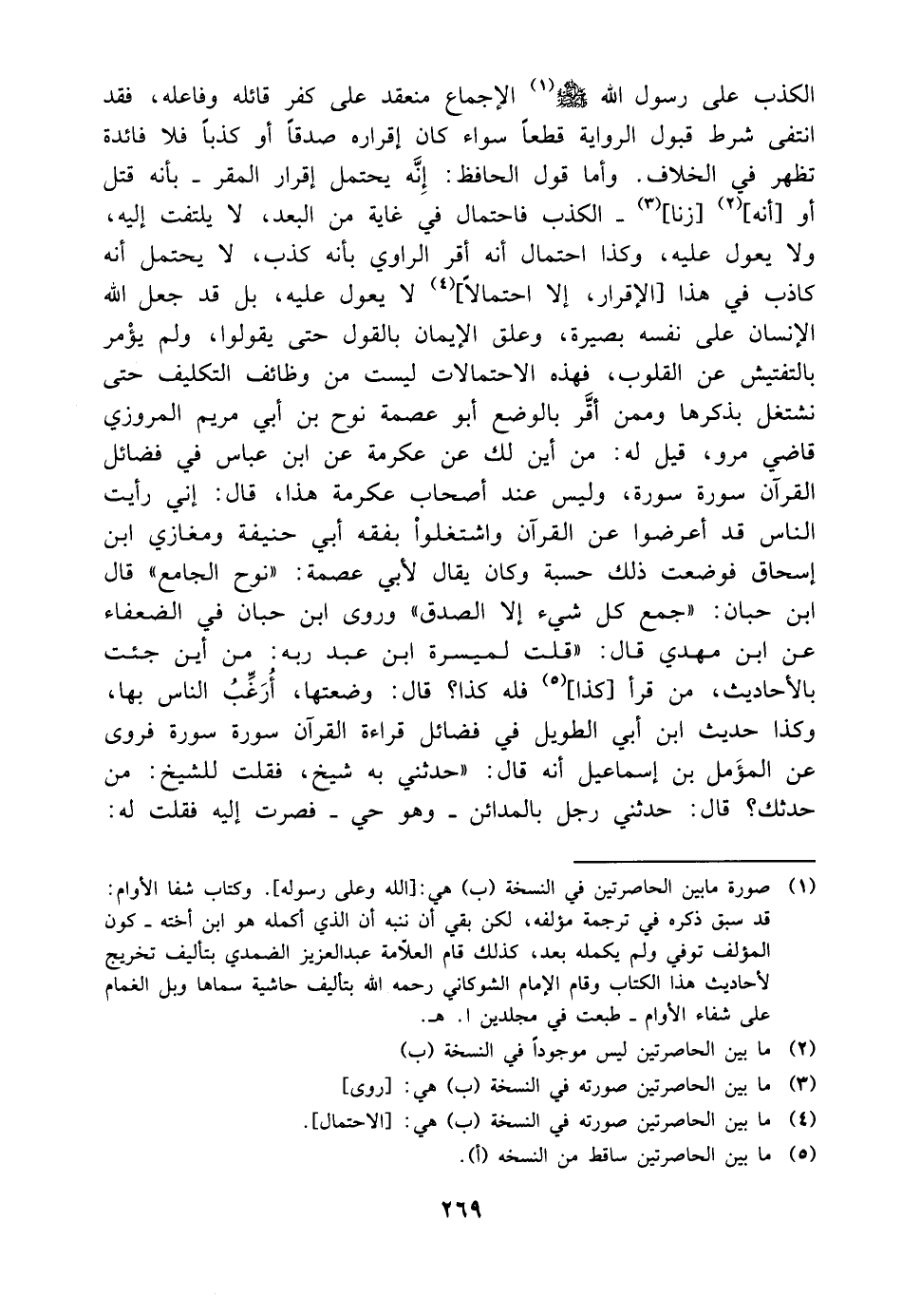 الكذب على رسول الله صلى الله عليه وسلم الإجماع منعقد على كفر قائله وفاعله فقد انتفى شرط قبول الرواية قطعا سواء كان إقراره صدقا أو كذبا فلا فائدة تظهر في الخلاف وأما قول الحافظ إنه يحتمل إقرار المقر بأنه قتل أو أنه زنا الكذب فاحتمال في غاية من البعد لا يلتفت إليه ولا يعول عليه وكذا احتمال أنه أقر الراوي بأنه كذب لا يحتمل أنه كاذب في هذا الإقرار إلا احتمال لا يعول عليه بل قد جعل الله الإنسان على نفسه بصيرة وعلق الإيمان بالقول حتى يقولوا ولم يؤمر بالتفتيش عن القلوب فهذه الاحتمالات ليست من وظائف التكليف حتى نشتغل بذكرها وممن أقر بالوضع أبو عصمة نوح بن أبي مريم المروزي قاضي مرو قيل له من أين لك عن عكرمة عن ابن عباس في فضائل القرآن سورة سورة وليس عند أصحاب عكرمة هذا قال إني رأيت الناس قد أعرضوا عن القرآن واشتغلوا بفقه أبي حنيفة ومغازي ابن إسحاق فوضعت ذلك حسبة وكان يقال لأبي عصمة نوح الجامع قال ابن حبان جمع كل شيء إلا الصدق وروى ابن حبان في الضعفاء عن ابن مهدي قال قلت لميسرة ابن عبد ربه من أين جئت بالأحاديث من قرأ كذا فله كذا قال وضعتها أرغب الناس بها وكذا حديث ابن أبي الطويل في فضائل قراءة القرآن سورة سورة فروى عن المؤمل بن إسماعيل أنه قال حدثني به شيخ فقلت للشيخ من حدثك قال حدثني رجل بالمدائن وهو حي فصرت إليه فقلت له