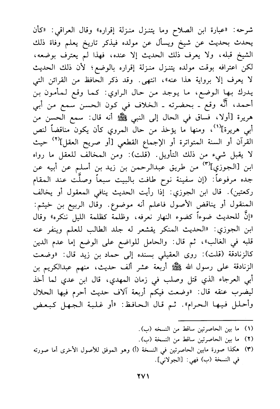 شرحه عبارة ابن الصلاح وما يتنزل منزلة إقراره وقال العراقي كأن يحدث بحديث عن شيخ ويسأل عن مولده فيذكر تاريخ يعلم وفاة ذلك الشيخ قبله ولا يعرف ذلك الحديث إلا عنده فهذا لم يعترف بوضعه لكن اعترافه بوقت مولده يتنزل منزلة إقراره بالوضع لأن ذلك الحديث لا يعرف إلا برواية هذا عنه انتهى وقد ذكر الحافظ من القرائن التي يدرك بها الوضع ما يوجد من حال الراوي كما وقع لمأمون بن أحمد أنه وقع بحضرته الخلاف في كون الحسن سمع من أبي هريرة أولا فساق في الحال إلى النبي صلى الله عليه وسلم أنه قال سمع الحسن من أبي هريرة ومنها ما يؤخذ من حال المروي كأن يكون مناقضا لنص القرآن أو السنة المتواترة أو الإجماع القطعي أو صريح العقل حيث لا يقبل شيء من ذلك التأويل قلت ومن المخالف للعقل ما رواه ابن الجوزي من طريق عبدالرحمن بن زيد بن أسلم عن أبيه عن جده مرفوعا إن سفينة نوح طافت بالبيت سبعا وصلت عند المقام ركعتين قال ابن الجوزي إذا رأيت الحديث ينافي المعقول أو يخالف المنقول أو يناقض الأصول فاعلم أنه موضوع وقال الربيع بن خيثم إن للحديث ضوءا كضوء النهار نعرفه وظلمة كظلمة الليل ننكره وقال ابن الجوزي الحديث المنكر يقشعرله جلد الطالب للعلم وينفر عنه قلبه في الغالب ثم قال والحامل للواضع على الوضع إما عدم الدين كالزنادقة قلت روى العقيلي بسنده إلى حماد بن زيد قال وضعت الزنادقة على رسول الله صلى الله عليه وسلم أربعة عشر ألف حديث منهم عبدالكريم بن أبي العرجاء الذي قتل وصلب في زمان المهدي قال ابن عدي لما أخذ ليضرب عنقه قال وضعت فيكم أربعة آلاف حديث أحرم فيها الحلال وأحلل فيها الحرام ثم قال الحافظ أو غلبة الجهل كبعض