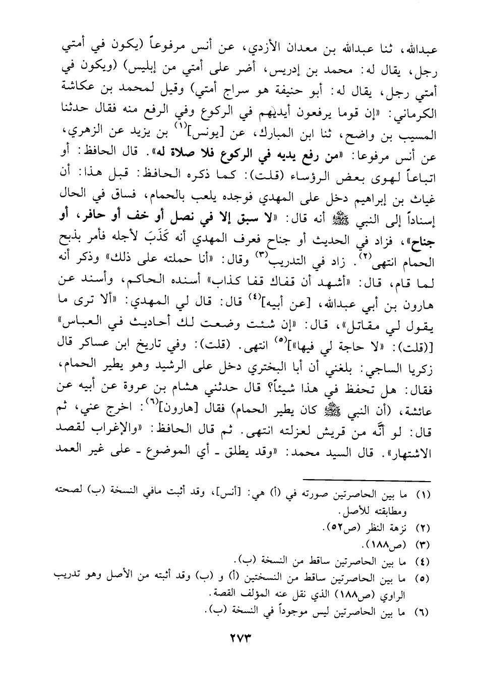 عبدالله ثنا عبدالله بن معدان الأزدي عن أنس مرفوعا يكون في أمتي رجل يقال له محمد بن إدريس أضر على أمتي من إبليس ويكون في أمتي رجل يقال له أبو حنيفة هو سراج أمتي وقيل لمحمد بن عكاشة الكرماني إن قوما يرفعون أيديهم في الركوع وفي الرفع منه فقال حدثنا المسيب بن واضح ثنا ابن المبارك عن يونس بن يزيد عن الزهري عن أنس مرفوعا من رفع يديه في الركوع فلا صلاة له قال الحافظ أو اتباعا لهوى بعض الرؤساء قلت كما ذكره الحافظ قبل هذا أن غياث بن إبراهيم دخل على المهدي فوجده يلعب بالحمام فساق في الحال إسنادا إلى النبي صلى الله عليه وسلم أنه قال لا سبق إلا في نصل أو خف أو حافر أو جناح فزاد في الحديث أو جناح فعرف المهدي أنه كذب لأجله فأمر بذبح الحمام انتهى زاد في التدريب وقال أنا حملته على ذلك وذكر أنه لما قام قال أشهد أن قفاك قفا كذاب أسنده الحاكم وأسند عن هارون بن أبي عبدالله عن أبيه قال قال لي المهدي ألا ترى ما يقول لي مقاتل قال إن شئت وضعت لك أحاديث في العباس قلت لا حاجة لي فيها انتهى قلت وفي تاريخ ابن عساكر قال زكريا الساجي بلغني أن أبا البختري دخل على الرشيد وهو يطير الحمام فقال هل تحفظ في هذا شيئا قال حدثني هشام بن عروة عن أبيه عن عائشة أن النبي صلى الله عليه وسلم كان يطير الحمام فقل هارون اخرج عني ثم قال لو أنه من قريش لعزلته انتهى ثم قال الحافظ والإغراب لقصد الاشتهار قال السيد محمد وقد يطلق أي الموضوع على غير العمد