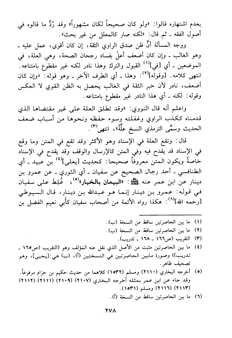 بعدم اشتهاره قالوا"ولو كان صحيحاً لكان مشهوراً" وقد رد ما قالوه في أصول الفقه ثم قال لكنه صار كالمعلل من غير بحث ووجه المسألة أن ظن صدق الراوي الثقة إن كان أقوى عمل عليه وهو الغالب وإن كان أضعف أعل بفساد رجحان الصحة وهي العلة في الموضعين أي في القبول والترك وهذا نادر لكنه غير مقطوع بامتناعه انتهى كلامه وقوله وهذا أي الطرف الآخر وهو قوله وإن كان أضعف نادر لأن خبر الثقة في الغالب يحصل به الظن القوي لا العكس وقوله لكنه أي هذا النادر غير مقطوع بامتناعه. واعلم أنه قال النووي "وقد تطلق العلة على غير مقتضاها الذي قدمناه ككذب الراوي وغفلته وسوء حفظه ونحوها من أسباب ضعف الحديث وسمى الترمذي النسخ علة"انتهى. قال وتقع العلة في الإسناد وهو الأكثر وقد تقع في المتن وما وقع في الإسناد قد يقدح فيه وفي المتن كالإرسال والوقف وقد يقدح في الإسناد خاصة ويكون المتن معروفاً صحيحا كحديث يعلى بن عبيد أي الطنافسي أحد رجال الصحيح عن سفيان أي الثوري عن عمرو بن دينار عن ابن عمر عنه صلى الله عليه وسلم "البيعان بالخيار" غلط على سفيان في قوله عمرو بن دينار إنما هو عبدالله بن دينار قال السيوطي رحمه الله هكذا رواه الأئمة من أصحاب سفيان كأبي نعيم الفضل بن