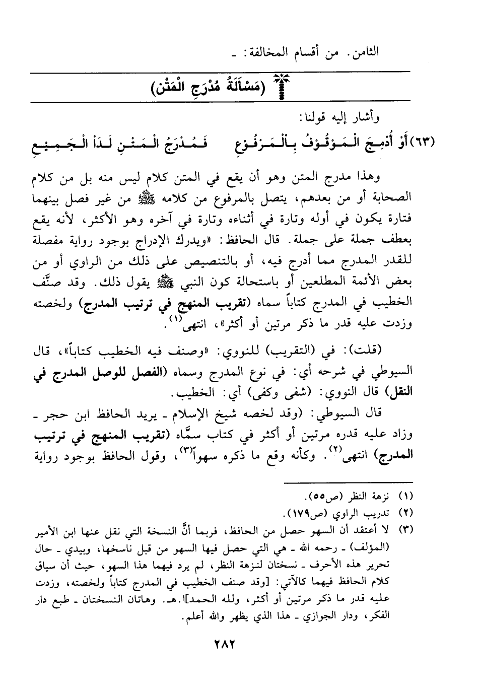 وهذا مدرج المتن وهو أن يقع في المتن كلام ليس منه بل من كلام الصحابة أومن بعدهم يتصل بالمرفوع من كلامه صلى الله عليه وسلم من غير فصل بينهما فتارة يكون في أوله وتارة في أثناءه وتارة في آخره وهو الأكثر لأنه يقع بعطف جملة على جملة قال الحافظ ويدرك الإدراج بوجود رواية مفصلة للقدر المدرج مما أدرج فيه أو بالتنصيص على ذلك من الراوي أو من بعض الأئمة المطلعين أو باستحالة كون النبي صلى الله عليه وسلم يقول ذلك وقد صنف الخطيب في المدرج كتابا سماه تقريب المنهج في ترتيب المدرج ولخصته وزدت عليه قدر ما ذكر مرتين أو أكثر انتهى قلت في التقريب للنووي وصنف فيه الخطيب كتابا قال السيوطي في شرحه أي في نوع المدرج وسماه الفصل للوصل المدرج في النقل قال النووي شفى وكفى أي الخطيب قال السيوطي وقد لخصه شيخ الإسلام يريد الحافظ ابن حجر وزاد عليه قدره مرتين أو أكثر في كتاب سماه تقريب المنهج في ترتيب المدرج انتهى وكأنه وقع ما ذكره سهوا وقول الحافظ بوجود رواية