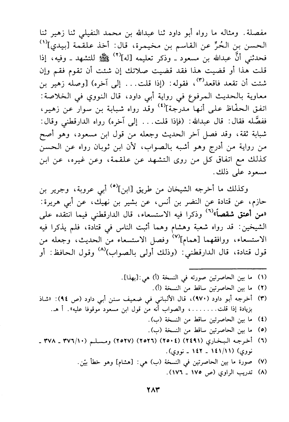 مفصلة ومثاله ما رواه أبو داود ثنا عبدالله بن محمد النفيلي ثنا زهير ثنا الحسن بن الحر عن القاسم بن مخيمرة قال أخذ علقمة بيدي فحدثني أن عبدالله بن مسعود وذكر تعليمه له صلى الله عليه وسلم للتشهد وفيه إذا قلت هذا أو قضيت هذا فقد قضيت صلاتك إن شئت أن تقوم فقم وإن شئت أن تقعد فاقعد فقوله إذا قلت إلى آخره وصله زهير بن معاوية بالحديث المرفوع في رواية أبي داود قال النووي في الخلاصة اتفق الحفاظ على أنها مدرجة وقد رواه شبابة بن سوار عن زهير ففصله فقال قال عبد الله فإذا قلت إلى آخره رواه الدارقطني وقال شبابة ثقة وقد فصل آخر الحديث وجعله من قول ابن مسعود وهو أصح من رواية من أدرج وهو أشبه بالصواب لأن ابن ثوبان رواه عن الحسن كذلك مع اتفاق كل من روى التشهد عن علقمة وعن غيره عن ابن مسعود على ذلك وكذلك ما أخرجه الشيخان من طريق ابن أبي عروبة وجرير بن حازم عن قتادة عن النضر بن أنس عن بشير بن نهيك عن أبي هريرة من أعتق شقصا وذكرا فيه الاستسعاء قال الدارقطني فيما انتقده على الشيخين قد رواه شعبة وهشام وهما أثبت الناس في قتادة فلم يذكرا فيه الاستسعاء ووافقهما همام وفصل الاستسعاء من الحديث وجعله من قول قتادة قال الدارقطني وذلك أولى بالصواب وقول الحافظ أو