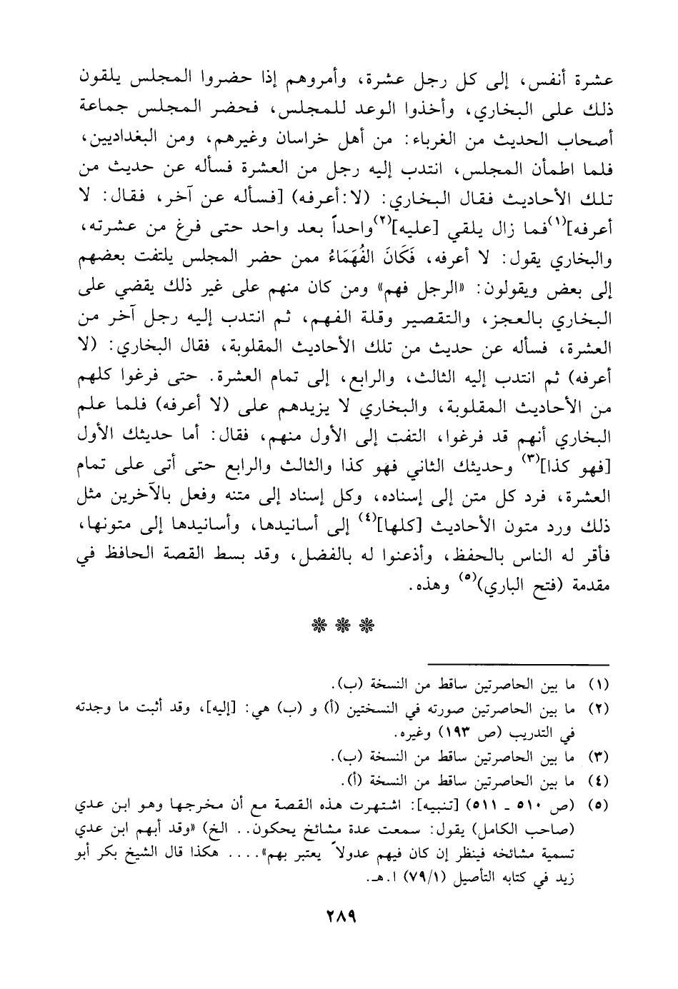 عشرة أنفس إلى كل رجل عشرة وأمروهم إذا حضروا المجلس يلقون ذلك على البخاري وأخذوا الوعد للمجلس فحضر المجلس جماعة أصحاب الحديث من الغرباء من أهل خراسان وغيرهم ومن البغداديين فلما اطمأن المجلس انتدب إليه رجل من العشرة فسأله عن حديث من تلك الأحاديث فقال البخاري لا أعرفه فسأله عن آخر فقال لا أعرفه فما زال يلقي عليه واحدا بعد واحد حتى فرغ من عشرته والبخاري يقول لا أعرفه فكان الفهماء ممن حضر المجلس يلتفت بعضهم إلى بعض ويقولون الرجل فهم ومن كان منهم على غير ذلك يقضي على البخاري بالعجز والتقصير وقلة الفهم ثم انتدب إليه رجل أخر من العشرة فسأله عن حديث من تلك الأحاديث المقلوبة فقال البخاري لا أعرفه ثم انتدب إليه الثالث والرابع إلى تمام العشرة حتى فرغوا كلهم من الأحاديث المقلوبة والبخاري لا يزيدهم على لا أعرفه فلما علم البخاري أنهم قد فرغوا التفت إلى الأول منهم فقال أما حديثك الأول فهو كذا وحديثك الثاني فهو كذا والثالث والرابع حتى أتى على تمام العشرة فرد كل متن إلى إسناده وكل إسناد إلى متنه وفعل بالآخرين مثل ذلك ورد متون الأحاديث كلها إلى أسانيدها وأسانيدها إلى متونها فأقر له الناس بالحفظ وأذعنوا له بالفضل وقد بسط القصة الحافظ في مقدمة فتح الباري وهذه