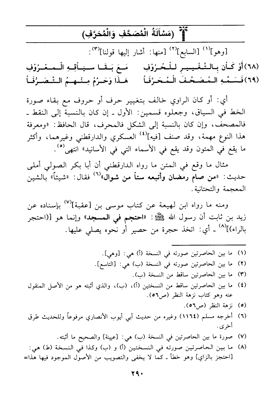 أي أو كان الراوي خالف بتغيير حرف أو حروف مع بقاء صورة الخط في السياق وجعلوه قسمين الأول إن كان بالنسبة إلى النقط فالمصحف وإن كان بالنسبة إلى الشكل فالمحرف قال الحافظ ومعرفة هذا النوع مهمة وقد صنف فيه العسكري والدارقطني وغيرهما وأكثر ما يقع في المتون وقد يقع في الأسماء التي في الأسانيد انتهى مثال ما وقع في المتن ما رواه الدارقطني أن أبا بكر الصولي أملى حديث من صام رمضان وأتبعه ستا من شوال فقال شيئا بالشين المعجمة والتحتانية ومنه ما رواه ابن لهيعة عن كتاب موسى بن عقبة بإسناده عن زيد بن ثابت أن رسول الله صلى الله عليه وسلم احتجم في المسجد وإنما هو احتجر بالراء أي اتخذ حجرة من حصير أو نحوه يصلي عليها