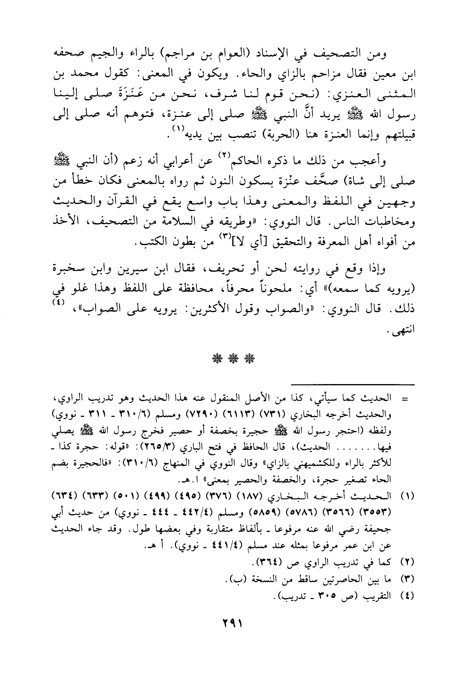 ومن التصحيف في الإسناد العوام بن مراجم بالراء والجيم صحفه ابن معين فقال مزاحم بالزاي والحاء ويكون في المعنى كقول محمد بن المثنى العنزي نحن قوم لنا شرف نحن من عنزة صلى إلينا رسول الله صلى الله عليه وسلم يريد أن النبي صلى الله عليه وسلم صلى إلى عنزة فتوهم أنه صلى إلى قبيلتهم وإنما العنزة هنا الحربة تنصب بين يديه وأعجب من ذلك ما ذكره الحاكم عن أعرابي أنه زعم أن النبي صلى الله عليه وسلم صلى إلى شاة صحف عنزة بسكون النون ثم رواه بالمعنى فكان خطأ من وجهين في اللفظ والمعنى وهذا باب واسع يقع في القرآن والحديث ومخاطبات الناس قال النووي وطريقه في السلامة من التصحيف الأخذ من أفواه أهل المعرفة والتحقيق أي لا من بطون الكتب وإذا وقع في روايته لحن أو تحريف فقال ابن سيرين وابن سخبرة يرويه كما سمعه أي ملحونا محرفا محافظة على اللفظ وهذا غلو في ذلك قال النووي والصواب وقول الأكثرين يرويه على الصواب انتهى