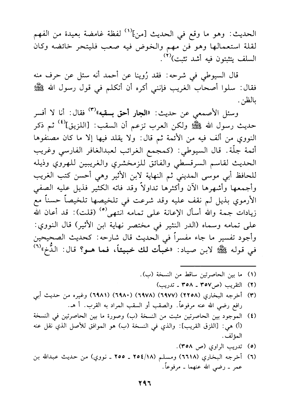 الحديث وهو ماوقع في الحديث من لفظة غامضة بعيدة من الفهم لقلة استعمالها وهو فن مهم والخوض فيه صعب فليتحر خائضه وكان السلف يتثبتون فيه أشد تثبت قال السيوطي في شرحه فقد روينا عن أحمد أنه سئل عن حرف منه فقال سلوا أصحاب الغريب فإنني أكره أن أتكلم في قول رسول الله صلى الله عليه وسلم بالظن وسئل الأصمعي عن حديث الجار أحق بسقبه فقال أنا لا أفسر حديث رسول الله صلى الله عليه وسلم ولكن العرب تزعم أن السقب اللزيق ثم ذكر النووي من ألف فيه من الأئمة ثم قال ولا يقلد فيها إلا ما كان مصنفوها أئمة جلة قال السيوطي كمجمع الغرائب لعبد الغافر الفارسي وغريب الحديث لقاسم السرقسطي والفائق للزمخشري والغريبين للهروي وذيله للحافظ أبي موسى المديني ثم النهاية لابن الأثير وهي أحسن كتب الغريب وأجمعها وأشهرها الآن وأكثرها تداولا وقد فاته الكثير فذيل عليه الصفي الأرموي بذيل لم نقف عليه وقد شرعت في تخليصها تلخيصا حسنا مع زيادات جمة والله أسأل الإعانة على تمامه انتهى قلت قد أعان الله على تمامه وسماه الدر النثير في مختصر نهاية ابن الأثير قال النووي وأجود تفسير ما جاء مفسرا في الحديث قال شارحه كحديث الصحيحين في قوله صلى الله عليه وسلم لابن صياد خبأت لك خبيئا فما هو قال الدخ