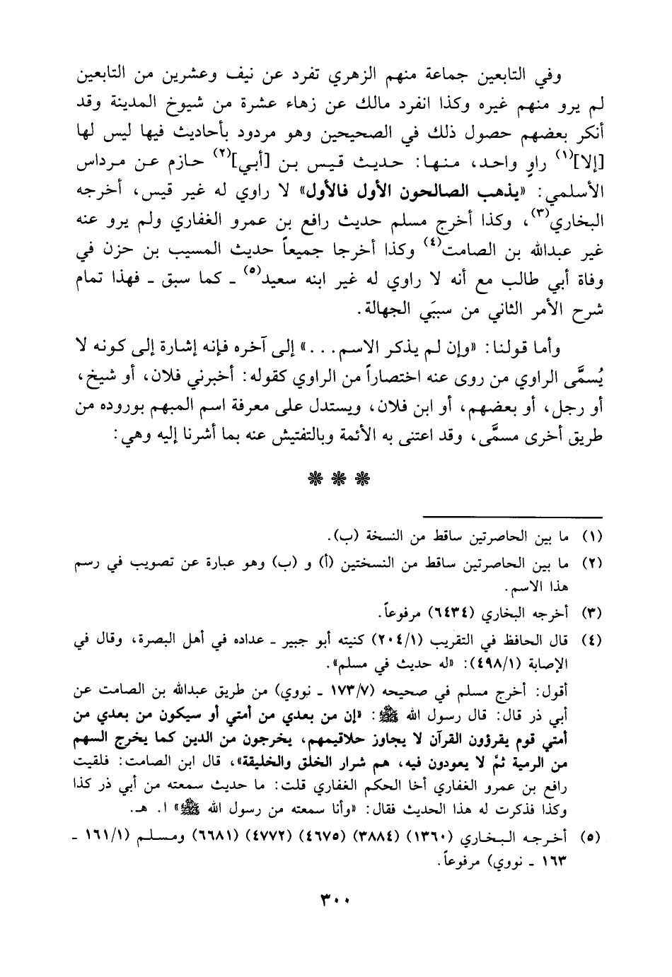 وفي التابعين جماعة منهم الزهري تفرد عن نيف وعشرين من التابعين لم يرو منهم غيره وكذا انفرد مالك عن زهاء عشرة من شيوخ المدينة وقد أنكر بعضهم حصول ذلك في الصحيحين وهو مردود بأحاديث فيها ليس لها إلا راو واحد منها حديث قيس بن أبي حازم عن مرداس الأسلمي يذهب الصالحون الأول فالأول لا راوي له غير قيس أخرجه البخاري وكذا أخرج مسلم حديث رافع بن عمرو الغفاري ولم يرو عنه غير عبدالله بن الصامت وكذا أخرجا جميعا حديث المسيب بن حزن في وفاة أبي طالب مع أنه لا راوي له غير ابنه سعيد كما سبق فهذا تمام شرح الأمر الثاني من سببي الجهالة وأما قولنا وإن لم يذكر الاسم إلى آخره فإنه إشارة إلى كونه لا يسمى الراوي من روى عنه اختصارا من الراوي كقوله أخبرني فلان أو شيخ أو رجل أو بعضهم أو ابن فلان ويستدل على معرفة اسم المبهم بوروده من طريق أخرى مسمى وقد اعتنى به الأئمة وبالتفتيش عنه بما أشرنا إليه وهي