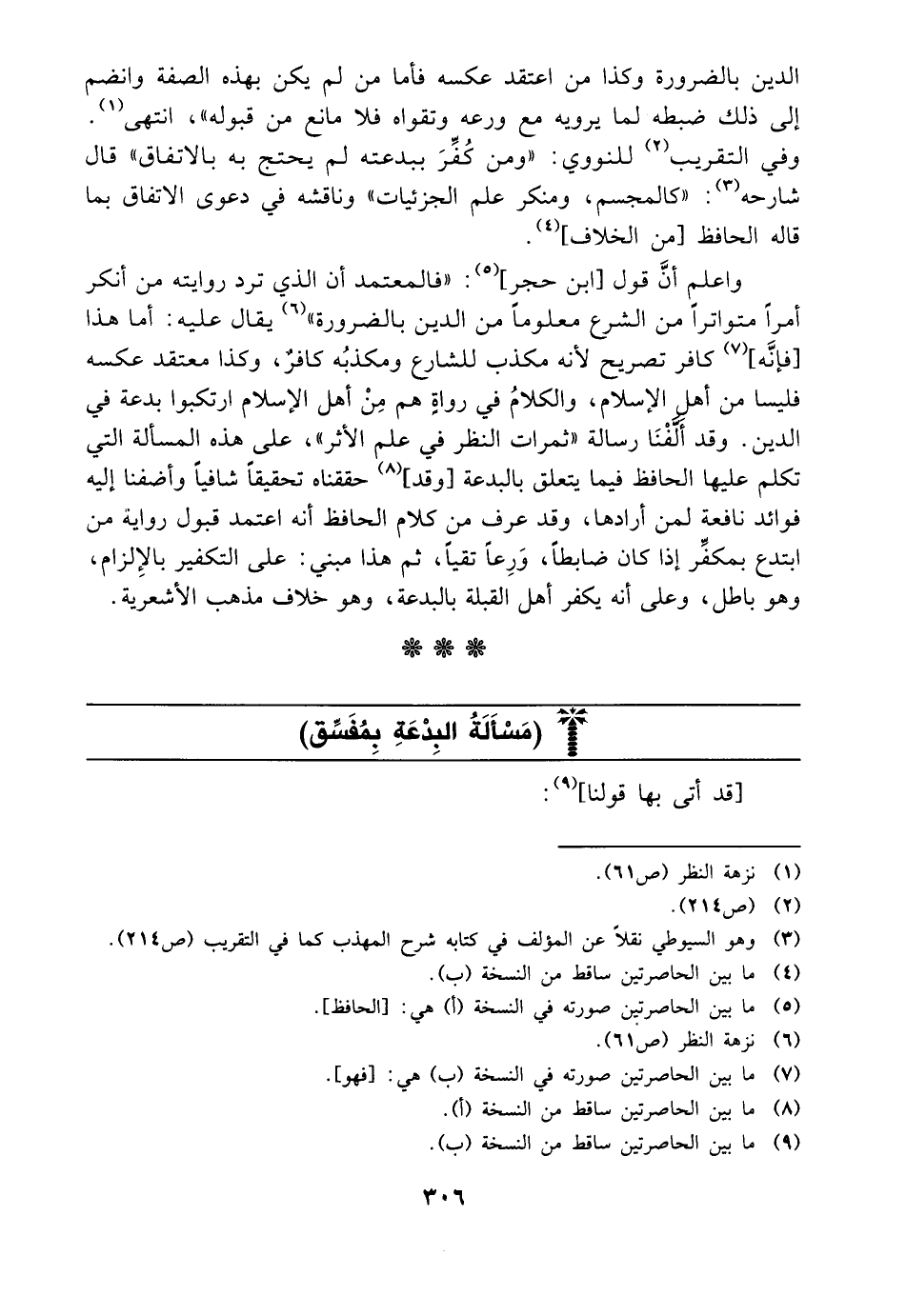 الدين بالضرورة وكذا من اعتقد عكسه فأما من لم يكن بهذه الصفة وانضم إلى ذلك ضبطه لما يرويه مع ورعه وتقواه فلا مانع من قبوله انتهى وفي التقريب للنووي ومن كفر ببدعته لم يحتج به بالاتفاق قال شارحه كالمجسم ومنكر علم الجزئيات وناقشه في دعوى الاتفاق بما قاله الحافظ من الخلاف واعلم أن قول ابن حجر فالمعتمد أن الذي ترد روايته من أنكر أمرا متواترا من الشرع معلوما من الدين بالضرورة يقال عليه أما هذا فإنه كافر تصريح لأنه مكذب للشارع ومكذبه كافر وكذا معتقد عكسه فليسا من أهل الإسلام والكلام في رواة هم من أهل الإسلام ارتكبوا بدعة في الدين وقد ألفنا رسالة ثمرات النظر في علم الأثر على هذه المسألة التي تكلم عليها الحافظ فيما يتعلق بالبدعة وقد حققناه تحقيقا شافيا وأضفنا إليه فوائد نافعة لمن أرادها وقد عرف من كلام الحافظ أنه اعتمد قبول رواية من ابتدع بمكفر إذا كان ضابطا ورعا تقيا ثم هذا مبني على التكفير بالإلزام وهو باطل وعلى أنه يكفر أهل القبلة بالبدعة وهو خلاف مذهب الأشعرية.