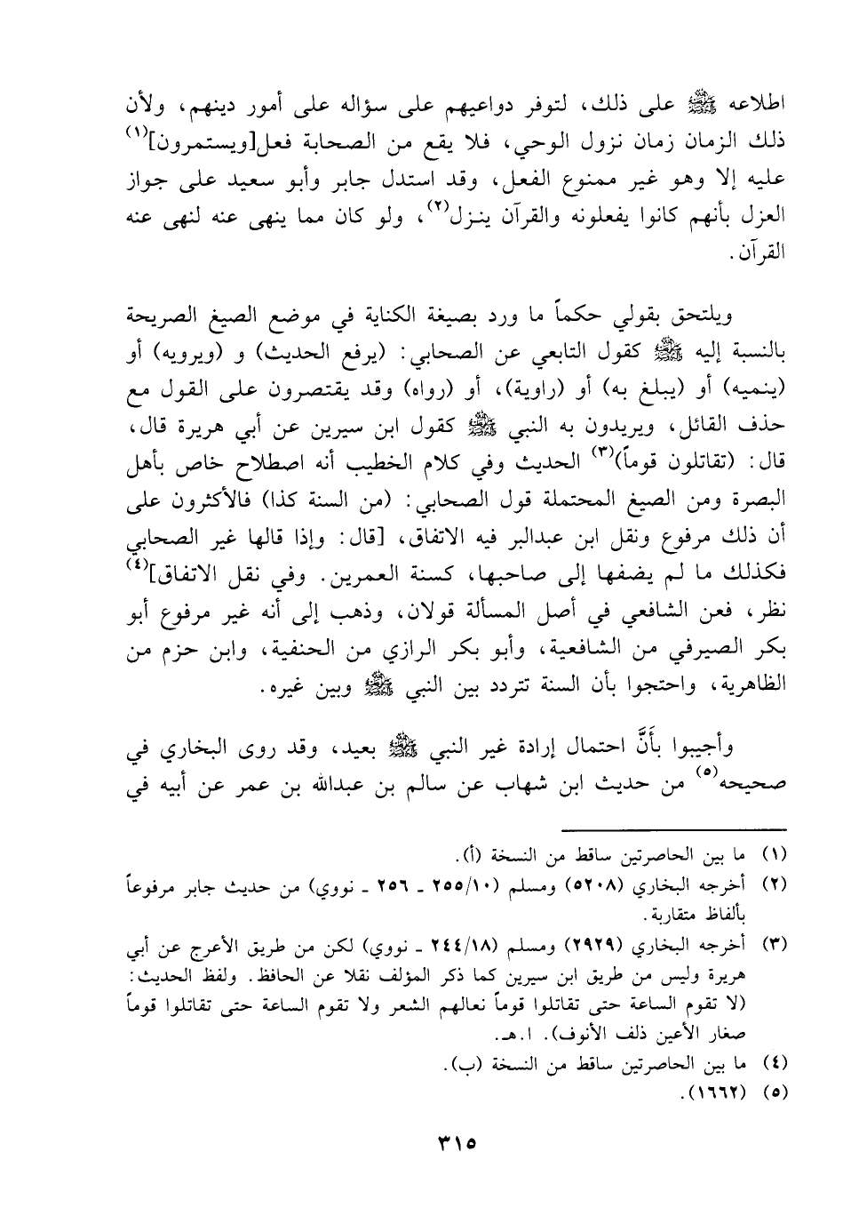 اطلاعه صلى الله عليه وسلم على ذلك لتوفر دواعيهم على سؤاله على أمور دينهم ولأن ذلك الزمان زمان نزول الوحي فلا يقع من الصحابة فعل ويستمرون عليه إلا وهو غير ممنوع الفعل وقد استدل جابر وأبو سعيد على جواز العزل بأنهم كانوا يفعلونهم والقرآن ينزل ولو كان مما ينهى عنه لنهى عنه القرآن ويلتحق بقولي حكما ما ورد بصيغة الكناية في موضع الصيغ الصريحة بالنسبة إليه صلى الله عليه وسلم كقول التابعي عن الصحابي يرفع الحديث ويرويه أو ينميه أو يبلغ به أو رواية أو رواه وقد يقتصرون على القول مع حذف القائل ويريدون به النبي صلى الله عليه وسلم كقول ابن سيرين عن أبي هريرة قال تقاتلون قوما الحديث وفي كلام الخطيب أنه اصطلاح خاص بأهل البصرة ومن الصيغ المحتملة قول الصحابي من السنة كذا فالأكثرون على أن ذلك مرفوع ونقل ابن عبدالبر فيه الاتفاق قال وإذا قالها غير الصحابي فكذلك ما لم يضفها إلى صاحبها كسنة العمرين وفي نقل الاتفاق نظر فعن الشافعي في أصل المسألة قولان وذهب إلى أنه غير مرفوع أبو بكر الصيرفي من الشافعية وأبو بكر الرازي من الحنفية وابن حزم من الظاهرية واحتجوا بأن السنة تتردد بين النبيصلى الله عليه وسلم وبين غيره وأجبيوا بأن احتمال إرادة غير النبي صلى الله عليه وسلم بعيد وقد روى البخاري في صحيحه من حديث ابن شهاب عن سالم بن عبدالله بن عمر عن أبيه في