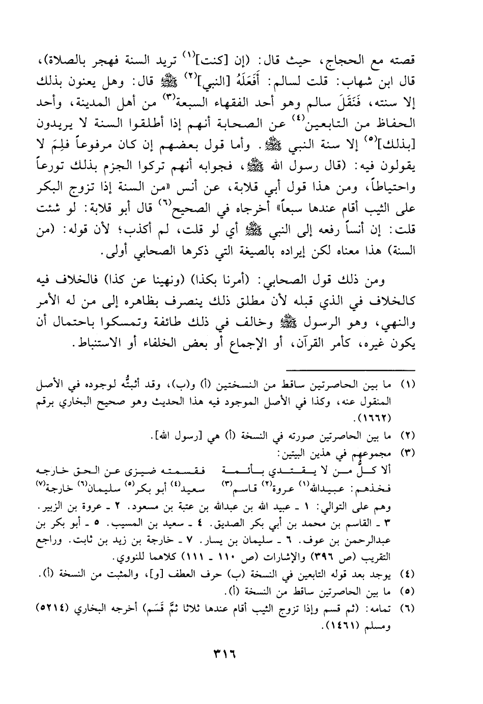 قصته مع الحجاج حيث قال إن كنت تريد السنة فهجر بالصلاة قال ابن شهاب قلت لسالم أفعله النبي صلى الله عليه وسلم قال وهل يعنون بذلك إلا سنته فنقل سالم وهو أحد الفقهاء السبعة من أهل المدينة وأحد الحفاظ من التابعين عن الصحابة أنهم إذا أطلقوا السنة لا يريدون بذلك إلا سنة النبي صلى الله عليه وسلم وأما قول بعضهم إن كان مرفوعا فلم لا يقولون فيه قال رسول الله صلى الله عليه وسلم فجوابه أنهم تركوا الجزم بذلك تورعا واحتياطا ومن هذا قول أبي قلابة عن أنس من السنة إذا تزوج البكر على الثيب أقام عندها سبعا أخرجاه في الصحيح قال أبو قلابة لو شئت قلت إن أنسا رفعه إلى النبي صلى الله عليه وسلم أي لو قلت لم أكذب لأن قوله من السنة هذا معناه لكن إيراده بالصيغة التي ذكرها الصحابي أولى ومن ذلك قول الصحابي أمرنا بكذا ونهينا عن كذا فالخلاف فيه كالخلاف في الذي قبله لأن مطلق ذلك ينصرف بظاهره إلى من له الأمر والنهي وهو الرسول صلى الله عليه وسلم وخالف في ذلك طائفة وتمسكوا باحتمال أن يكون غيره كأمر القرآن أو الإجماع أو بعض الخلفاء أو الاستنباط