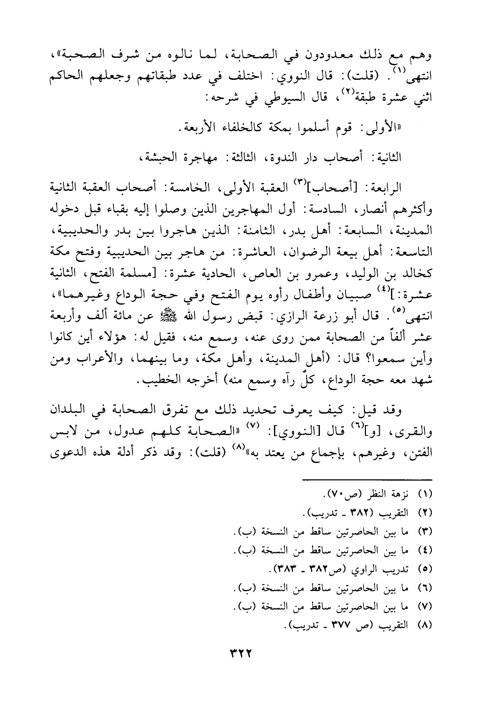 وهم مع ذلك معدودون في الصحابة لما نالوه من شرف الصحبة انتهى قلت قال النووي اختلف في عدد طبقاتهم وجعلهم الحاكم اثني عشر طبقة قال السيوطي في شرحه الأولى قوم أسلموا بمكة كالخلفاء الأربعة الثانية أصحاب دار الندوة الثالثة مهاجرة الحبشة الرابعة أصحاب العقبة الأولى الخامسة أصحاب العقبة الثانية وأكثرهم أنصار السادسة أول المهاجرين الذين وصلوا إليه بقباء قبل دخوله المدينة السابعة أهل بدر الثامنة الذين هاجروا بين بدر والحديبية التاسعة أهل بيعة الرضوان العاشرة من هاجر بين الحديبية وفتح مكة كخالد بن الوليد وعمرو بن العاص الحادية عشر مسلمة الفتح الثانية عشرة صبيان وأطفال رأوه يوم الفتح وفي حجة الوداع وغيرهما انتهى قال أبو زرعة الرازي قبض رسول الله صلى الله عليه وسلم عن مائة ألف وأربعة عشر ألفا من الصحابة ممن روى عنه وسمع منه فقيل له هؤلاء أين كانوا وأين سمعوا قال أهل المدينة وأهل مكة وما بينهما والأعراب ومن شهد معه حجة الوداع كل رآه وسمع منه أخرجه الخطيب وقد قيل كيف يعرف تحديد ذلك مع تفرق الصحابة في البلدان والقرى وقال النووي الصحابة كلهم عدول من لابس الفتن وغيرهم بإجماع من يعتد به قلت وقد ذكر أدلة هذه الدعوى