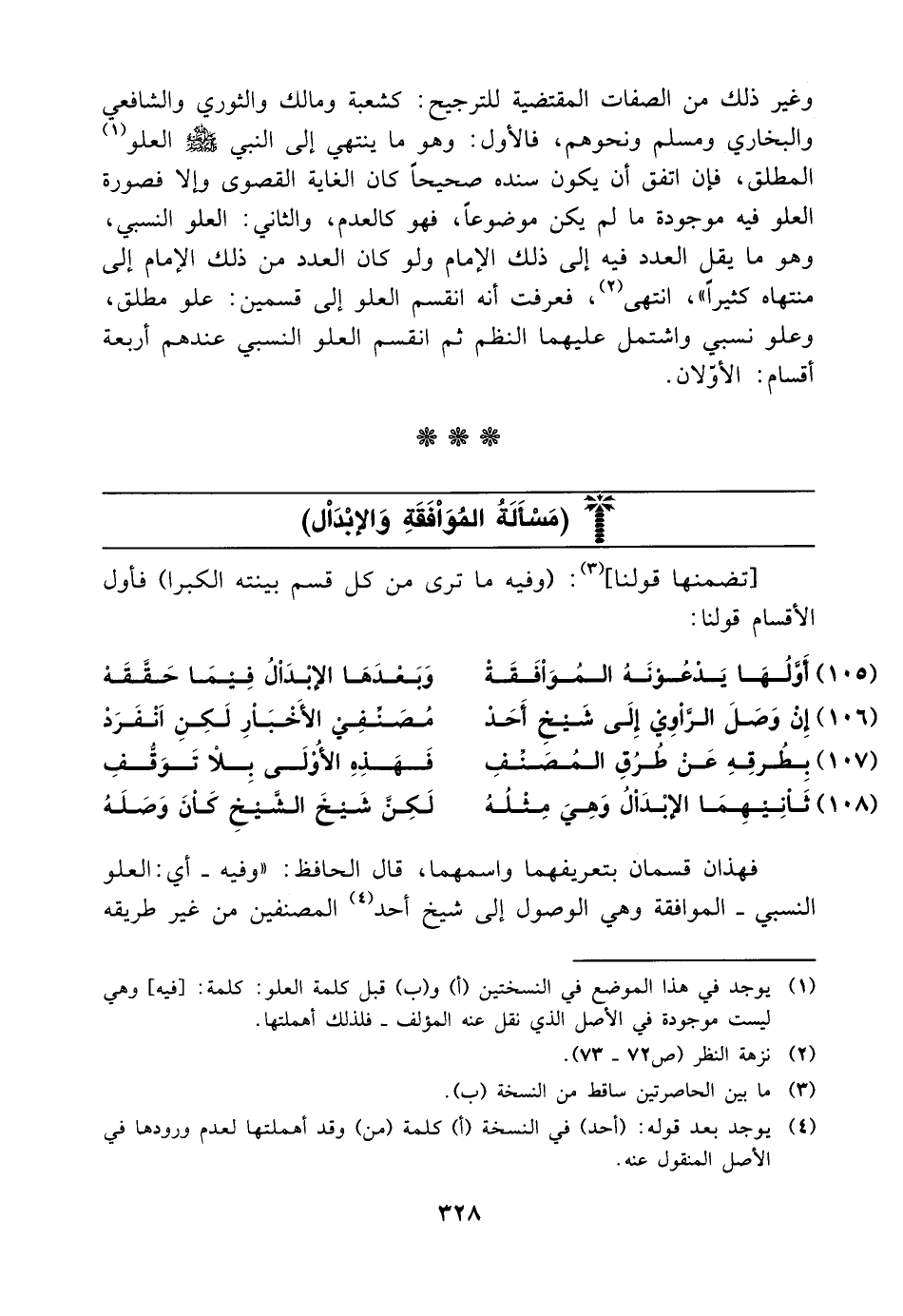 وغير ذلك من الصفات المقتضية للترجيح كشعبة ومالك والثوري والشافعي والبخاري ومسلم ونحوهم فالأول وهو ما ينتهي إلى النبي صلى الله عليه وسلم العلو المطلق فإن اتفق أن يكون سنده صحيحا كان الغاية القصوى وإلا فصورة العلو فيه موجودة ما لم يكن موضوعا فهو كالعدم والثاني العلو النسبي وهو ما يقل العدد فيه إلى ذلك الإمام ولو كان العدد من ذلك الإمام إلى منتهاه كثيرا انتهى فعرفت أنه انقسم العلو إلى قسمين علو مطلق وعلو نسبي واشتمل عليهما النظم ثم انقسم العلو النسبي عندهم أربعة أقسام الأولان.