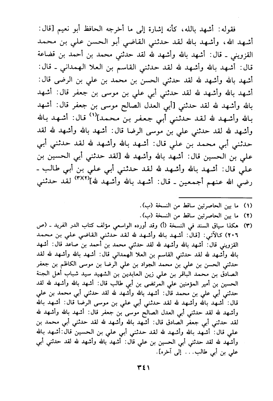 فقوله أشهد بالله كأنه إشارة إلى ما أخرجه الحافظ أبو نعيم قال أشهد الله وأشهد بالله لقد حدثني القاضي أبو الحسن علي بن محمد القزويني قال أشهد بالله وأشهد لله لقد حدثني محمد بن أحمد بن قضاعة قال أشهد بالله وأشهد لله لقد حدثني القاسم بن العلا الهمداني قال أشهد بالله وأشهد لله لقد حدثني الحسن بن محمد بن علي بن الرضى قال أشهد بالله وأشهد لله لقد حدثني أبي علي بن موسى بن جعفر قال أشهد بالله وأشهد لله لقد حدثني أبي العدل الصالح موسى بن جعفر قال أشهد بالله وأشهد لله لقد حدثني أبي جعفر بن محمد قال أشهد بالله وأشهد لله لقد حدثني علي بن موسى الرضا قال أشهد بالله وأشهد لله لقد حدثني أبي محمد بن علي قال أشهد بالله وأشهد لله لقد حدثني أبي علي بن الحسين قال أشهد بالله وأشهد لله لقد حدثني أبي الحسين بن علي قال أشهد بالله وأشهد لله لقد حدثني أبي علي بن أبي طالب رضي الله عنهم أجمعين قال أشهد بالله وأشهد لله لقد حدثني