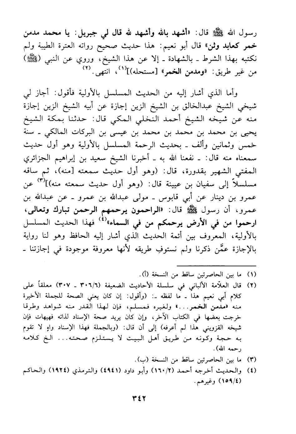 رسول الله صلى الله عليه وسلم قال أشهد بالله وأشهد لله قال لي جبريل يا محمد مدمن خمر كعابد وثن قال أبو نعيم هذا حديث صحيح رواته العترة الطيبة ولم نكتبه بهذا الشرط بالشهادة إلا عن هذا الشيخ وروي عن النبي صلى الله عليه وسلم من غير طريق ومدمن الخمر مستحله انتهى وأما الذي أشار إليه من الحديث المسلسل بالأولية فأقول أجاز لي شيخي الشيخ عبدالخالق بن الشيخ الزين إجازة عن أبيه الشيخ الزين إجازة منه عن شيخه الشيخ أحمد النخلي المكي قال حدثنا بمكة الشيخ يحيى بن محمد بن محمد بن محمد بن عيسى بن البركات المالكي سنة خمس وثمانين وألف بحديث الرحمة المسلسل بالأولية وهو أول حديث سمعناه منه قال نفعنا الله به أخبرنا الشيخ سعيد بن إبراهيم الجزائري المفتي الشهير بقدورة قال وهو أول حديث سمعته منه ثم ساقه مسلسلا إلى سفيان بن عيينة قال وهو أول حديث سمعته منه عن عمرو بن دينار عن أبي قابوس مولى عبدالله بن عمرو عن عبدالله بن عمرو أن رسول صلى الله عليه وسلم قال الراحمون يرحمهم الرحمن تبارك وتعالى ارحموا من في الأرض يرحمكم من في السماء فهذا الحديث المسلسل بالأولية المعروف بين أئمة الحديث الذي أشار إليه الحافظ وهو لنا رواية بالإجازة عمن ذكرنا ولم نستوف طريقه لأنها معروفة موجودة في إجازتنا