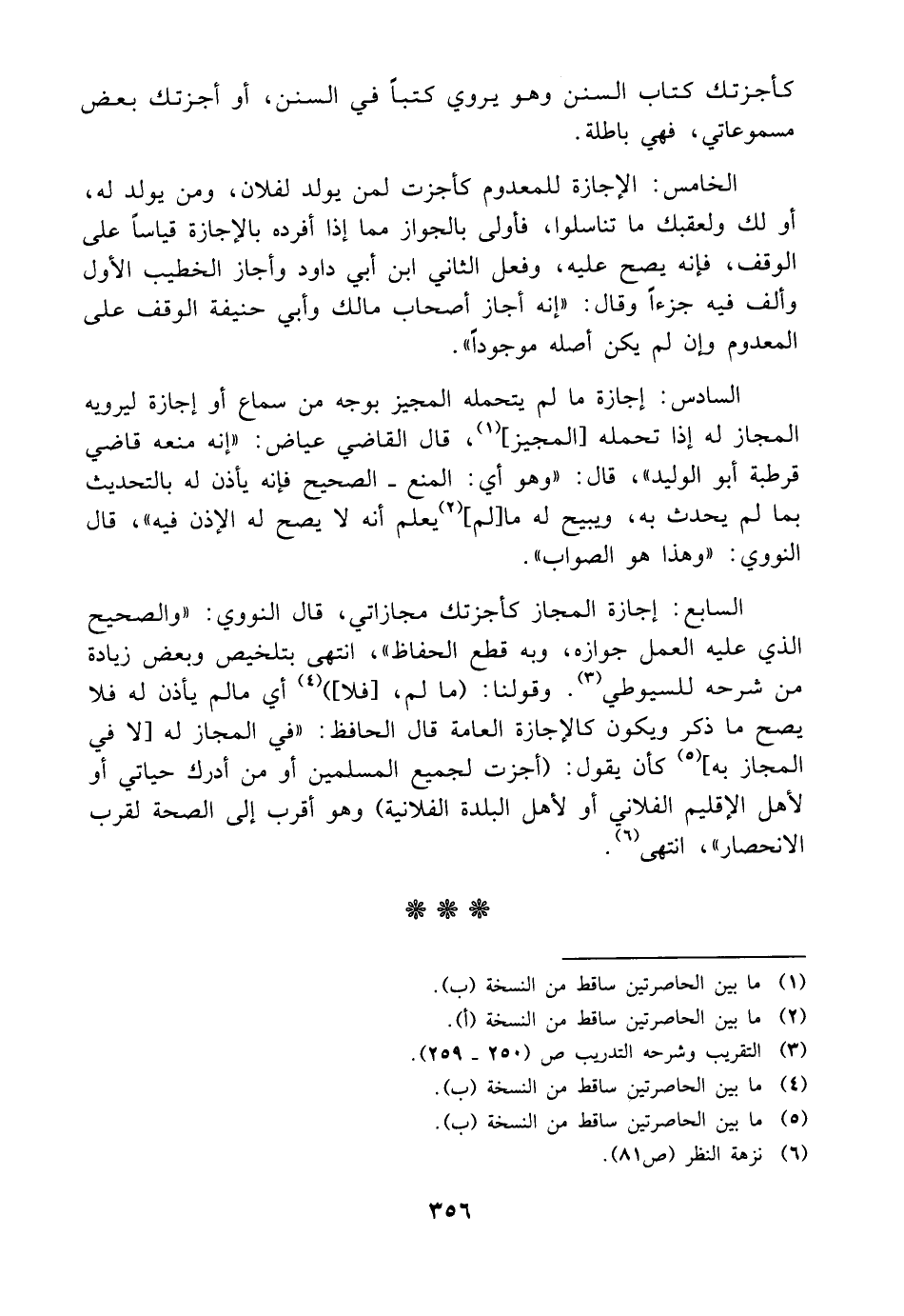 كأجزتك كتاب السنن وهو يروي كتبا في السنن أو أجزتك بعض مسموعاتي فهي باطلة الخامس الإجازة للمعدوم كأجزت لمن يولد لفلان ومن يولد له أولك ولعقبك ما تناسلوا فأولى بالجواز مما إذا أفرده بالإجازة قياسا على الوقف فإنه يصح عليه وفعل الثاني ابن أبي داود وأجاز الخطيب الأول وألف فيه جزءا وقال إنه أجاز أصحاب مالك وأبي حنيفة الوقف على المعدوم وإن لم يكن أصله موجودا السادس إجازة ما لم يتحمله المجيز بوجه من سماع أو إجازة ليرويه المجاز له إذا تحمله المجيز قال القاضي عياض إنه منعه قاضي قرطبة أبو الوليد قال وهو أي المنع الصحيح فإنه يأذن له بالتحديث بما لم يحدث به ويبيح له ما لم يعلم أنه لا يصح له الإذن فيه قال النووي وهذا هو الصواب السابع إجازة المجاز كأجزتك مجازاتي قال النووي والصحيح الذي عليه العمل جوازه وبه قطع الحفاظ انتهى بتلخيص وبعض زيادة من شرحه للسيوطي وقولنا ما لم فلا أي ما لم يأذن له فلا يصح ما ذكر ويكون كالإجازة العامة قال الحافظ في المجاز له لا في المجاز به كأن يقول أجزت لجميع المسلمين أو من أدرك حياتي أو لأهل الإقليم الفلاني أو لأهل البلدة الفلانية وهو أقرب إلى الصحة لقرب الانحصار انتهى