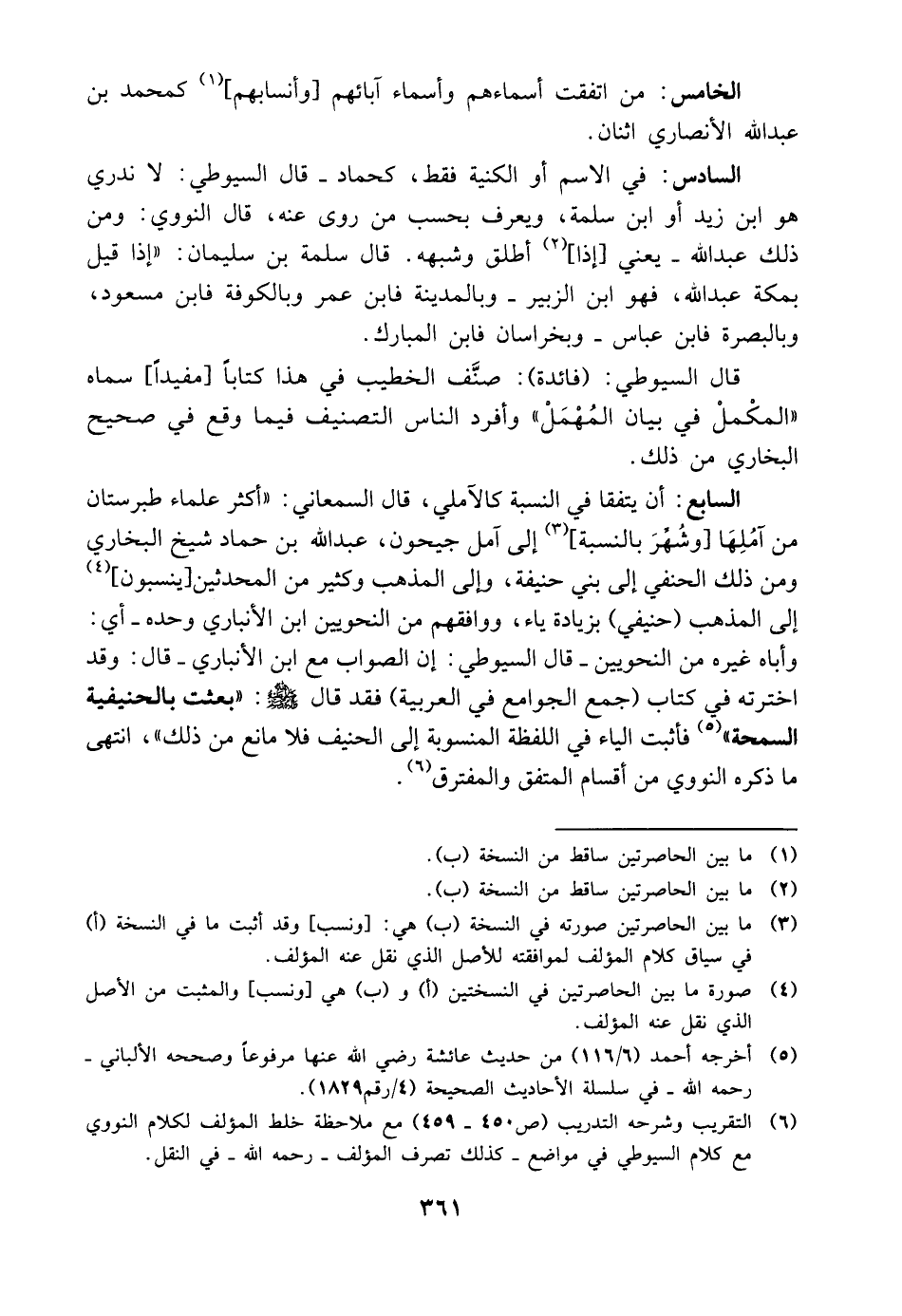 الخامس من اتفقت أسماءهم وأسماء آبائهم وأنسابهم كمحمد بن عبدالله الأنصاري اثنان السادس في الاسم أو الكنية فقط كحماد قال السيوطي لا ندري هو ابن زيد أو ابن سلمة ويعرف بحسب من روى عنه قال النووي ومن ذلك عبدالله يعني إذا أطلق وشبهه قال سلمة بن سليمان إذا قيل بمكة عبدالله فهو ابن الزبير وبالمدينة فابن عمر وبالكوفة فابن مسعود وبالبصرة فابن عباس وبخراسان فابن المبارك قال السيوطي فائدة صنف الخطيب في هذا كتابا مفيدا سماه المكمل في بيان المهمل وأفرد الناس التصنيف فيما وقع في صحيح البخاري من ذلك السابع أن يتفقا في النسبة كالآملي قال السمعاني أكثر علماء طبرستان من آملها وشهر بالنسبة إلى آمل جيحون عبدالله بن حماد شيخ البخاري ومن ذلك الحنفي إلى بني حنيفة وإلى المذهب وكثير من المحدثين ينسبون إلى المذهب الحنفي بزيادة ياء ووافقهم من النحويين ابن الأنباري وحده أي وأباه غير من النحويين قال السيوطي إن الصواب مع ابن الأنباري قال وقد اخترته في كتاب جمع الجوامع في العربية فقد قال صلى الله عليه وسلم بعثت بالحنيفية السمحة فأثبت الياء في اللفظة المنسوبة إلى الحنيف فلا مانع من ذلك انتهى ما ذكره النووي من أقسام المتفق والمفترق