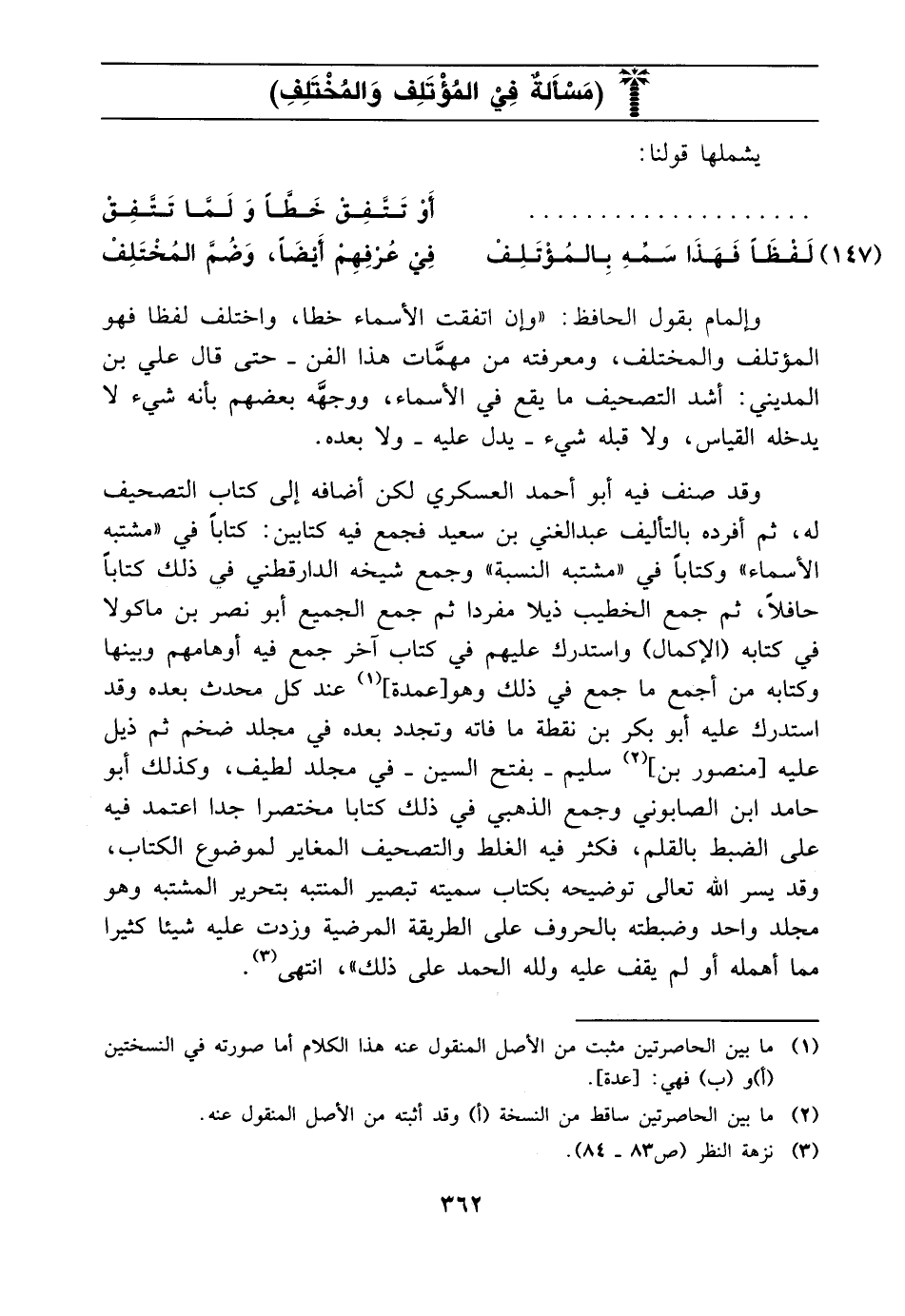 وإلمام بقول الحافظ وإن اتفقت الأسماء خطا واختلف لفظا فهو المؤتلف والمختلف ومعرفته من مهمات هذا الفن حتى قال علي بن المديني أشد التصحيف ما يقع في الأسماء ووجهه بعضهم بأنه شيء لا يدخله القياس ولا قبله شيء يدل عليه ولا بعده وقد صنف فيه أبو أحمد العكسري لكن أضافه إلى كتاب التصحيف له ثم أفرده بالتأليف عبدالغني بن سعيد فجمع فيه كتابين كتابا في مشتبه الأسماء وكتابا في مشتبه النسبة وجمع شيخه الدارقطني في ذلك كتابا حافلا ثم جمع الخطيب ذيلا مفردا ثم جمع الجميع أبو نصر بن ماكولا في كتابه الإكمال واستدرك عليهم في كتاب آخر جمع فيه أوهامهم وبينها وكتابه من أجمع ما جمع في ذلك وهو عمدة عند كل محدث بعده وقد استدرك عليه أبو بكر بن نقطة ما فاته وتجدد بعده في مجلد ضخم ثم ذيل عليه منصور بن سليم بفتح السين في مجلد لطيف وكذلك أبو حامد ابن الصابوني وجمع الذهبي في ذلك كتابا مختصرا جدا اعتمد فيه على الضبط بالقلم فكثر فيه الغلط والتصحيف المغاير لموضوع الكتاب وقد يسر الله تعالى توضيحه بكتاب سميته تبصير المنتبه بتحرير المشتبه وهو مجلد واحد وضبطته بالحروف على الطريقة المرضية وزدت عليه شيئا كثيرا مما أهمله أو لم يقف عليه ولله الحمد على ذلك انتهى