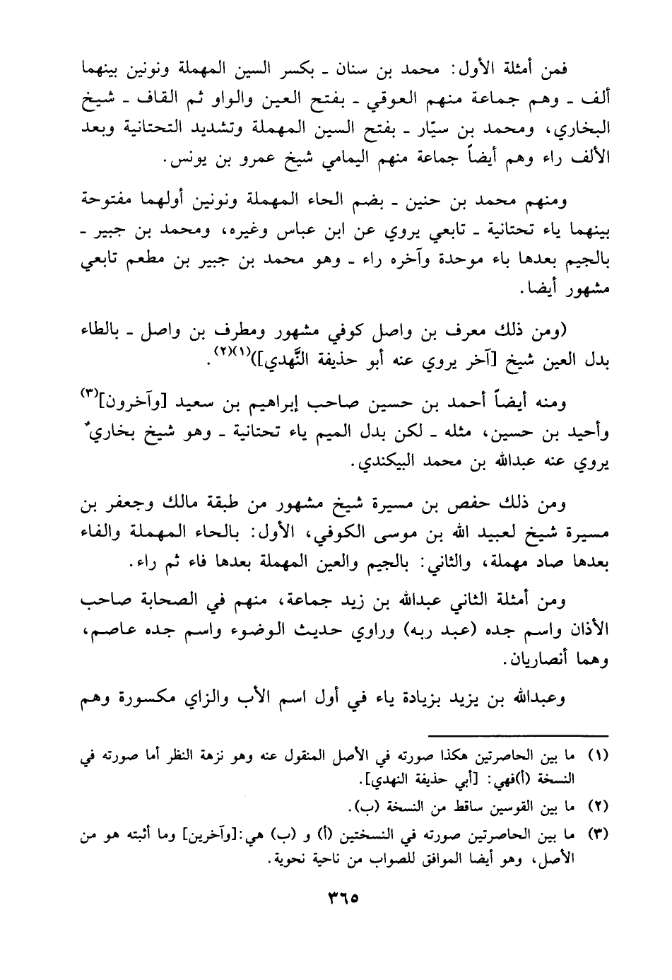 فمن أمثلة الأول محمد بن سنان بكسر السين المهملة ونونين بينهما ألف وهم جماعة منهم العوقي بفتح العين والواو ثم القاف شيخ البخاري ومحمد بن سيار بفتح السين المهلمة وتشديد التحتانية وبعد الألف راء وهم أيضا جماعة منهم اليمامي شيخ عمرو بن يونس ومنهم محمد بن حنين بضم الحاء المهملة ونونين أولهما مفتوحة بينهما ياء تحتانية تابعي يروي عن ابن عباس وغيره ومحمد بن جبير بالجيم بعدها باء موحدة وآخره راء وهو محمد بن جبير بن مطعم تابعي مشهور أيضا ومن ذلك معرف بن واصل كوفي مشهور ومطرف بن واصل بالطاء بدل العين شيخ آخر يروي عنه أبو حذيفة النهدي ومنه أيضا أحمد بن حسين صاحب إبراهيم بن سعيد وآخرون وأحيد بن حسين مثله لكن بدل الميم ياء تحتانية وهو شيخ بخاري يروي عنه عبدالله بن محمد البيكندي ومن ذلك حفص بن ميسرة شيخ مشهور من طبقة مالك وجعفر بن مسيرة شيخ لعبيد الله بن موسى الكوفي الأول بالحاء المهملة والفاء بعدها صاد مهملة والثاني بالجيم والعين المهملة بعدها فاء ثم راء ومن أمثلة الثاني عبدالله بن زيد جماعة منهم في الصحابة صاحب الأذان واسم جده عبد ربه وراوي حديث الوضوء واسم جده عاصم وهما أنصاريان وعبدالله بن يزيد بزيادة ياء في أول اسم الأب والزاي مكسروة وهم
