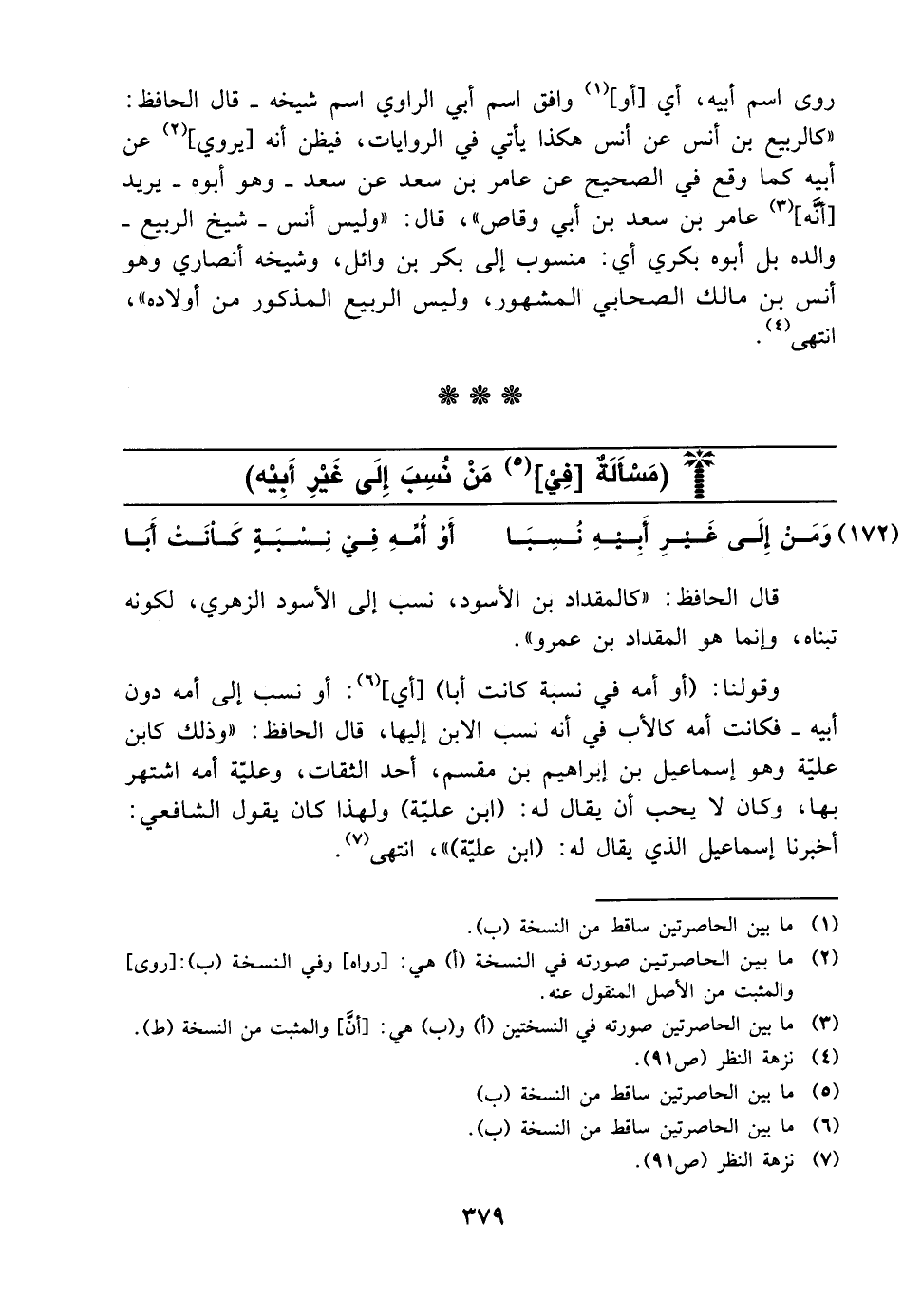قال الحافظ كالمقداد بن الأسود نسب إلى الأسود الزهري لكونه تبناه وإنما هو المقداد بن عمرو وقولنا أو أمه في نسبة كانت أبا أي أو نسب إلى أمه دون أبيه فكانت أمه كالأب في أنه نسب الابن إليها قال الحافظ وذلك كابن علية وهو إسماعيل بن إبراهيم بن مقسم أحد الثقات وعلية أمه اشتهر بها وكان لا يحب أن يقال له ابن علية ولهذا كان يقول الشافعي أخبرنا إسماعيل الذي يقال له ابن علية انتهى