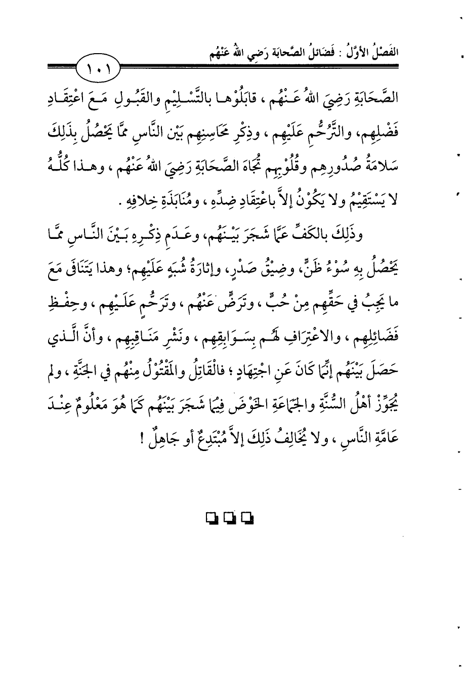 الصَّحَابَةِ رَضِيَ اللهُ عَنْهُم، قابَلُوْها بالتَّسْلِيْمِ والقَبُولِ مَعَ اعْتِقَادِ فَضْلِهِم، والتَّرُحُّمِ عَلَيْهِم، وذِكْرِ مَحَاسِنِهِم بَيْن النَّاسِ ممَّا يَحْصُلُ بِذَلِكَ سَلامَةُ صُدُورِهِم وقُلُوْبِهِم تُجَاهَ الصَّحَابَةِ رَضِيَ اللهُ عَنْهُم، وهذا كُلُّهُ لا يَسْتَقِيْمُ ولا يَكُوْنُ إلاَّ باعْتِقَادِ ضِدِّهِ، ومُنَابَذَةِ خِلافِهِ.