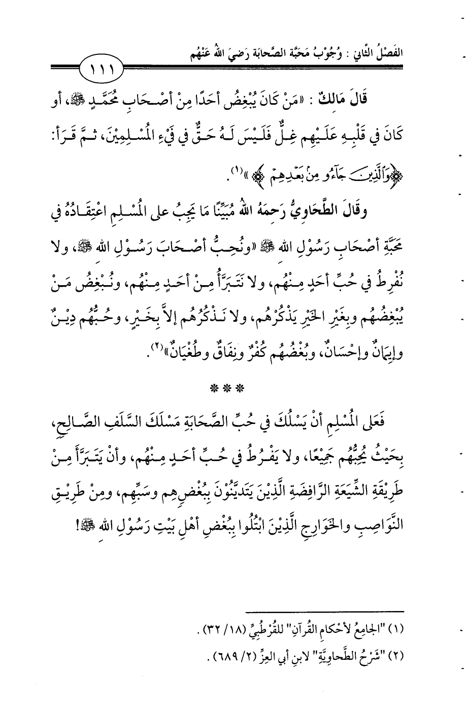 وقَالَ الطَّحَاوِيُّ رَحِمَهُ اللهُ مُبَيِّنًا مَا يَجِبُ على المُسْلِمِ اعْتِقَادُهُ في مَحَبَّةِ أصْحَابِ رَسُوْلِ اللهِ - صلى الله عليه وسلم - «ونُحِبُّ أصْحَابَ رَسُوْلِ اللهِ - صلى الله عليه وسلم -، ولا نُفْرِطُ في حُبِّ أحَدٍ مِنْهُم، ولا نَتَبَرَّأُ مِنْ أحَدٍ مِنْهُم، ونُبْغِضُ مَنْ يُبْغِضُهُم وبِغَيْرِ الخَيْرِ يَذْكُرُهُم، ولا نَذْكُرُهُم إلاَّ بِخَيْرٍ، وحُبُّهُم دِيْنٌ وإيِمَانٌ وإحْسَانٌ، وبُغْضُهُم كُفْرٌ ونِفَاقٌ وطُغْيَانٌ» (¬2).