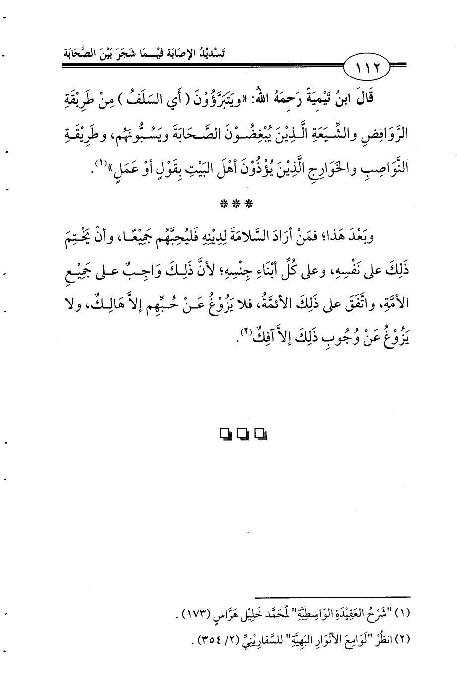 قَالَ ابنُ تَيْمِيَةّ رَحِمَهُ اللهُ: «ويَتَبَرَّؤُوْنَ (أَي السَلَفُ) مِنْ طَرِيْقَةِ الرَّوَافِضِ والشِّيَعَةِ الَّذِيْنَ يُبْغِضُوْنَ الصَّحَابَةَ ويَسُبُّونَهُم، وطَرِيْقَةِ النَّوَاصِبِ والخَوَارِجِ الَّذِيْنَ يُؤْذُوْنَ أهْلَ البَيْتِ بِقَوْلٍ أوْ عَمَلٍ» (¬1).