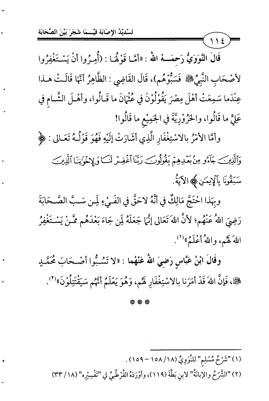 وبِهَذا احْتَجَّ مَالِكٌ في أنَّهُ لاحَقَّ في الفَيْءِ لِمَن سَبَّ الصَّحَابَةَ رَضِيَ اللهُ عَنْهُم؛ لأنَّ اللهَ تَعَالى إنَّمَا جَعَلَهُ لِمَن جَاءَ بَعْدَهُم ممَّنْ يَسْتَغْفِرُ اللهَ لَهُم، واللهُ أعْلَمُ» (¬1).