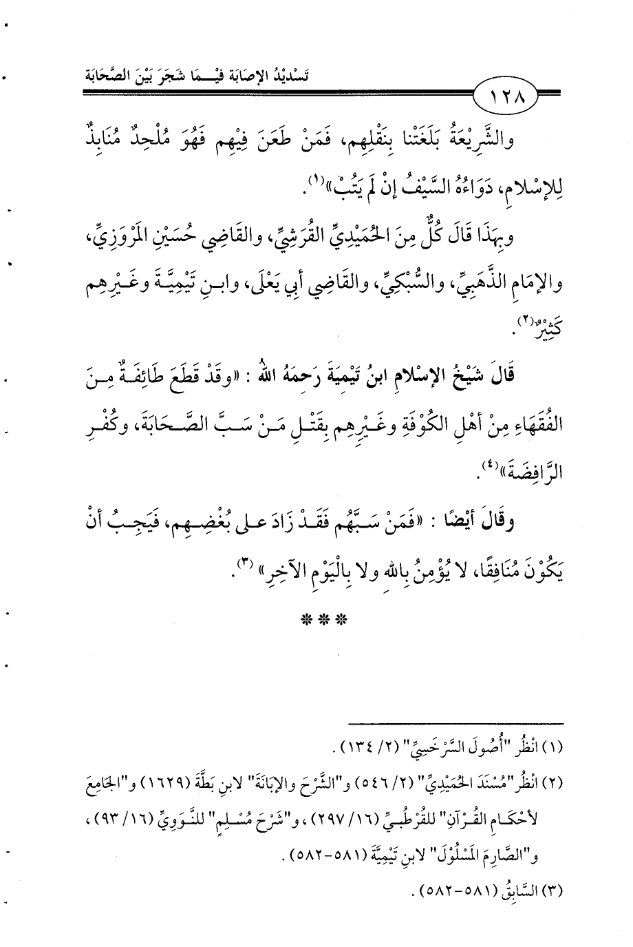 قَالَ شَيْخُ الإسْلامِ ابنُ تَيْمِيَةَ رَحِمَهُ اللهُ: «وقَدْ قَطَعَ طَائِفَةٌ مِنَ الفُقَهَاءِ مِنْ أهْلِ الكُوْفَةِ وغَيْرِهِم بِقَتْلِ مَنْ سَبَّ الصَّحَابَةَ، وكُفْرِ الرَّافِضَةِ» (4).