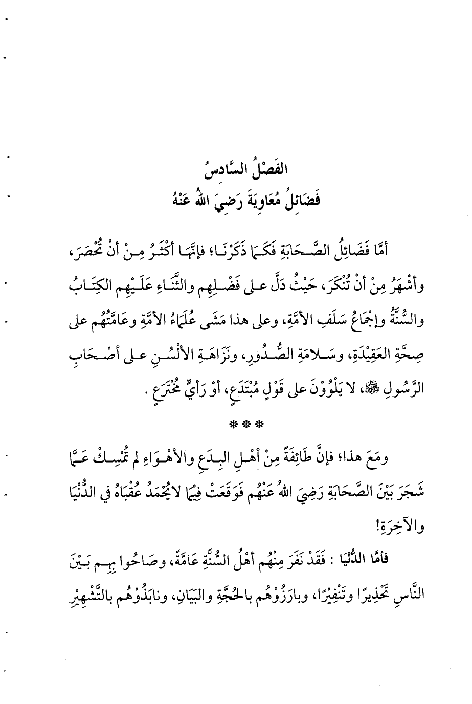 أمَّا فَضَائِلُ الصَّحَابَةِ فَكَمَا ذَكَرْنَا؛ فإنَّهَا أكْثَرُ مِنْ أنْ تُحْصَرَ، وأشْهَرُ مِنْ أنْ تُنْكَرَ، حَيْثُ دَلَّ على فَضْلِهِم والثَّنَاءِ عَلَيْهِم الكِتَابُ والسُّنَّةُ وإجْمَاعُ سَلَفِ الأمَّةِ، وعلى هذا مَشَى عُلَمَاءُ الأمَّةِ وعَامَّتُهُم على صِحَّةِ العَقِيْدَةِ، وسَلامَةِ الصُّدُورِ، ونَزَاهَةِ الألْسُنِ على أصْحَابِ الرَّسُولِ - صلى الله عليه وسلم -، لا يَلْوُوْنَ على قَوْلٍ مُبْتَدَعٍ، أوْ رَأيٍّ مُخْتَرَعٍ.
