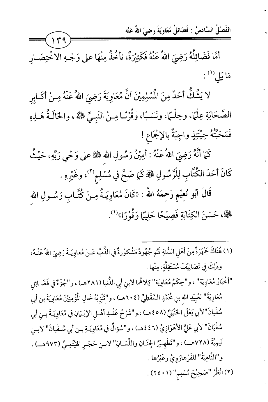 لا يَشُكُّ أحَدٌ مِنَ المُسْلِمِيْنَ أنَّ مُعَاوِيَةَ رَضِيَ اللهُ عَنْهُ مِنْ أكَابِرِ الصَّحَابَةِ عِلْمًا، وحِلْمًا، ونَسَبًا، وقُرْبًا مِنْ النَبِيِّ - صلى الله عليه وسلم -، والحَالَةُ هَذِهِ فَمَحَبَّتُهُ حِيْنَئِذٍ واجِبَةٌ بالإجْمَاعِ!