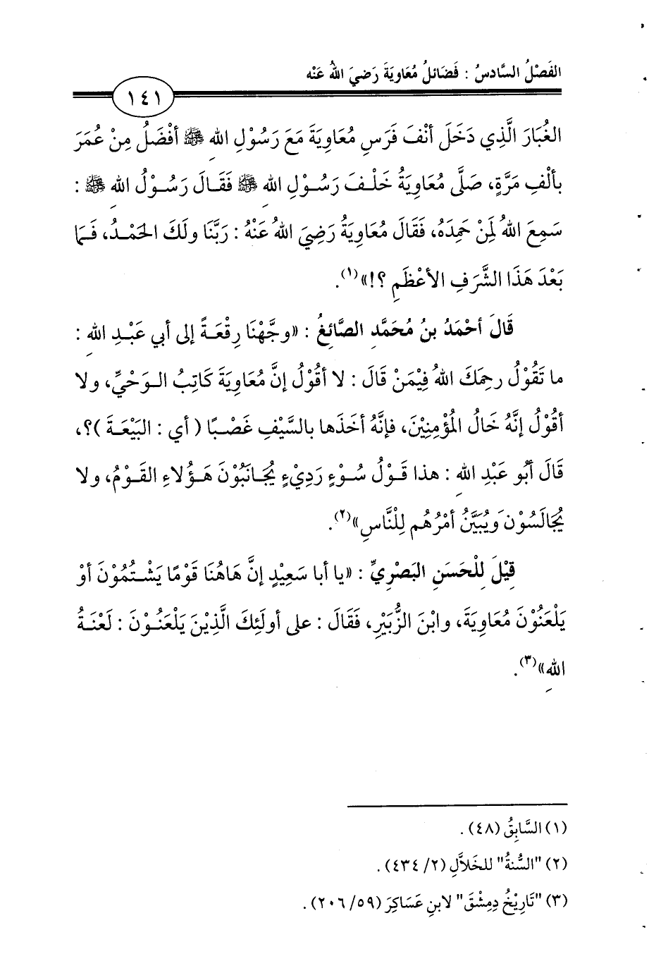 الغُبَارَ الَّذِي دَخَلَ أنْفَ فَرَسِ مُعَاوِيَةَ مَعَ رَسُوْلِ اللهِ - صلى الله عليه وسلم - أفْضَلُ مِنْ عُمَرَ بألْفِ مَرَّةٍ، صَلَّى مُعَاوِيَةُ خَلْفَ رَسُوْلِ اللهِ - صلى الله عليه وسلم - فَقَالَ رَسُوْلُ اللهِ - صلى الله عليه وسلم -: سَمِعَ اللهُ لِمَنْ حَمِدَهُ، فَقَالَ مُعَاوِيَةُ رَضِيَ اللهُ عَنْهُ: رَبَّنَا ولَكَ الحَمْدُ، فَمَا بَعْدَ هَذَا الشَّرَفِ الأعْظَمِ؟!» (¬1).