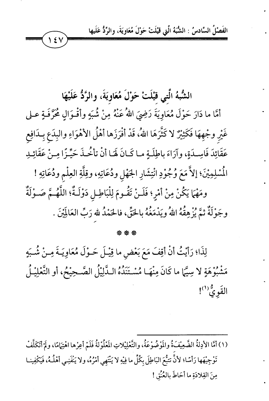 لِذَا؛ رَأيْتُ أنْ أقِفَ مَعَ بَعْضِ ما قِيْلَ حَوْلَ مُعَاوِيَةَ مِنْ شُبَهٍ مَشْبُوْهَةٍ لا سِيَّمَا ما كَانَ مِنْهَا مُسْتَنَدُهُ الدَّلِيْلُ الصَّحِيْحُ، أو التَّعْلِيْلُ القَوِيُّ (¬1)!