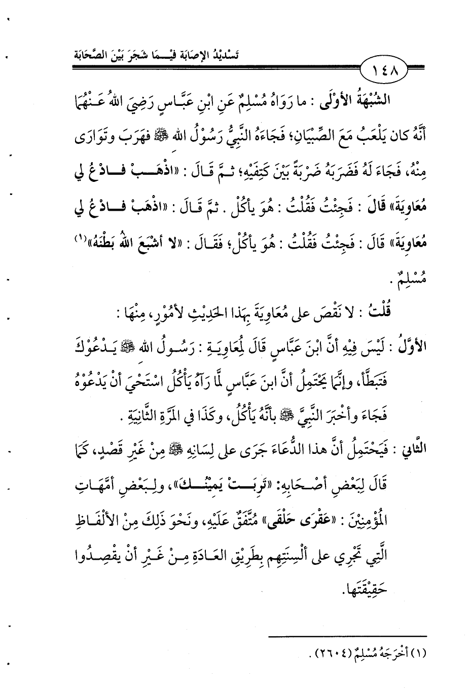 الشُبْهَةُ الأوْلَى: ما رَوَاهُ مُسْلِمٌ عَنِ ابْنِ عَبَّاسٍ رَضِيَ اللهُ عَنْهُمَا أنَّهُ كان يَلْعَبُ مَعَ الصِّبْيَانِ؛ فَجَاءَهُ النَّبِيُّ رَسُوْلُ اللهِ - صلى الله عليه وسلم - فهَرَبَ وتَوَارَى مِنْهُ، فَجَاءَ لَهُ فَضَرَبَهُ ضَرْبَةً بَيْنَ كَتِفَيْهِ؛ ثمَّ قَالَ: «اذْهَبْ فادْعُ لي مُعَاوِيَةَ» قَالَ: فَجِئْتُ فَقُلْتُ: هُوَ يأكُلْ. ثمَّ قَالَ: «اذْهَبْ فادْعُ لي مُعَاوِيَةَ» قَالَ: فَجِئْتُ فَقُلْتُ: هُوَ يأكُلْ؛ فَقَالَ: «لا أشْبَعَ اللهُ بَطْنَهُ» (¬1) مُسْلِمٌ.