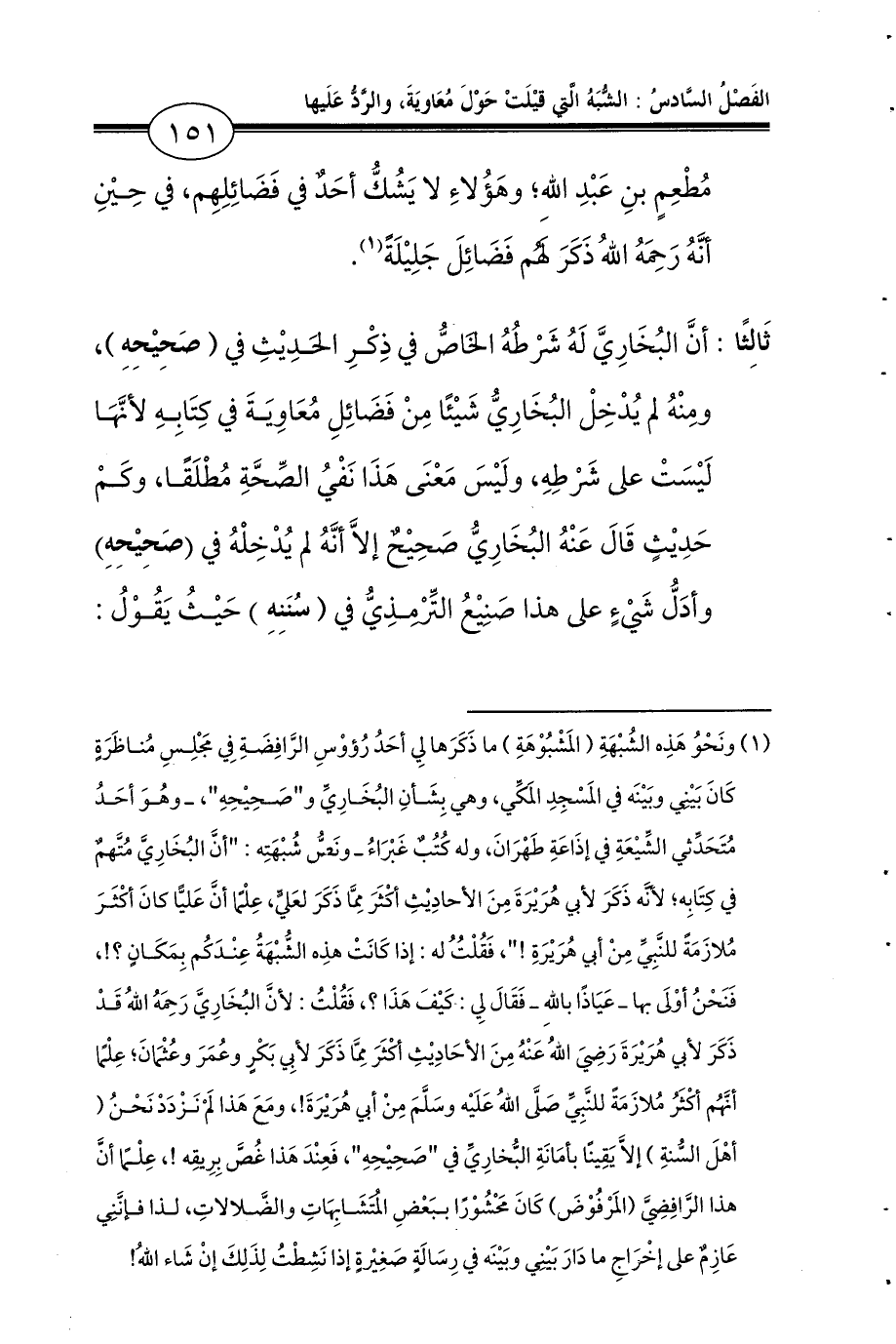 (¬1) ونَحْوُ هَذِه الشُبْهَةِ (المَشْبُوْهَةِ) ما ذَكَرَها لِي أحَدُ رُؤوْسِ الرَّافِضَةِ فِي مَجْلِسِ مُناظَرَةٍ كَانَ بَيْنِي وبَيْنَه في المَسْجِدِ المَكِّي، وهي بِشَأنِ البُخَارِيِّ و «صَحِيْحِهِ»، ـ وهُوَ أحَدُ مُتَحَدِّثي الشِّيْعَةِ في إذَاعَةِ طَهْرَانَ، وله كُتُبٌ غَبْرَاءُ ـ ونَصُّ شُبْهَتِه: «أنَّ البُخَارِيَّ مُتَّهمٌ في كِتَابِه؛ لأنَّه ذَكَرَ لأبي هُرَيْرَةَ مِنَ الأحادِيْثِ أكْثَرَ مِمَّا ذَكَرَ لعَليٍّ، عِلْمًا أنَّ عَليًّا كانَ أكْثَرَ مُلازَمَةً للنَّبِيِّ مِنْ أبي هُرَيْرَةَ!»، فَقُلْتُ له: إذا كَانَتْ هذِه الشُّبْهَةُ عِنْدَكُم بِمَكَانٍ؟!، فَنَحْنُ أوْلَى بها ـ عَيَاذًا باللهِ ـ فَقَالَ لِي: كَيْفَ هَذَا؟ فَقُلْتُ: لأنَّ البُخَارِيَّ رَحِمَهُ اللهُ قَدْ ذَكَرَ لأبي هُرَيْرَةَ رَضِيَ اللهُ عَنْهُ مِنَ الأحَادِيْثِ أكْثَرَ مِمَّا ذَكَرَ لأبِي بَكْرٍ وعُمَرَ وعُثْمَانَ؛ عِلْمًا أنَّهُم أكْثَرُ مُلازَمَةً للنَّبِيِّ صَلَّى اللهُ عَلَيْه وسَلَّمَ مِنْ أبي هُرَيْرَةَ!، ومَعَ هَذا لَمْ نَزْدَدْ نَحْنُ (أهْلَ السُّنةِ) إلاَّ يَقِينًا بأمَانَةِ البُّخارِيِّ في «صَحِيْحِهِ»، فَعِنْدَ هَذا غُصَّ بِرِيقِه!، عِلْمًا أنَّ هذا الرَّافِضِيَّ (المَرْفُوْضَ) كَانَ مَحْشُوْرًا ببَعْضِ المُتَشَابِهَاتِ والضَّلالاتِ، لذا فإنَّنِي عَازِمٌ على إخْرَاجِ ما دَارَ بَيْنِي وبَيْنَه في رِسَالَةٍ صَغِيْرةٍ إذا نَشِطْتُ لِذَلِكَ إنْ شَاء اللهُ!