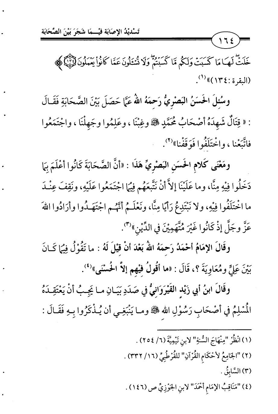 ومَعْنَى كَلامِ الحَسَنِ البَصْرِيِّ هَذَا: «أنَّ الصَّحَابَةَ كَانُوا أعْلَمَ بِمَا دَخَلُوا فِيْهِ مِنَّا، وما عَلَيْنَا إلاَّ أنْ نَتَّبعَهُم فِيْمَا اجْتَمَعُوا عَلَيْهِ، ونَقِفَ عِنْدَ ما اخْتَلَفُوا فِيْهِ، ولا نَبْتَدِعُ رَأيًا مِنَّا، ونَعْلَمُ أنَّهُم اجْتَهَدُوا وأرَادُوا اللهَ عَزَّ وجَلَّ إذْ كَانُوا غَيْرَ مُتَّهَمِيْنَ في الدِّيْنِ» (¬3).