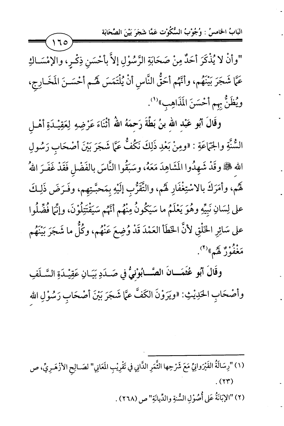 «وأنْ لا يُذْكَرَ أحَدٌ مِنْ صَحَابَةِ الرَّسُوْلِ إلاَّ بأحْسَنِ ذِكْرٍ، والإمْسَاكِ عَمَّا شَجَرَ بَيْنَهُم، وأنَّهُم أحَقُّ النَّاسِ أنْ يُلْتَمَسَ لَهُم أحْسَنَ المَخَارِجِ، ويُظَنُّ بِهِم أحْسَنَ المَذَاهِبِ» (¬1).