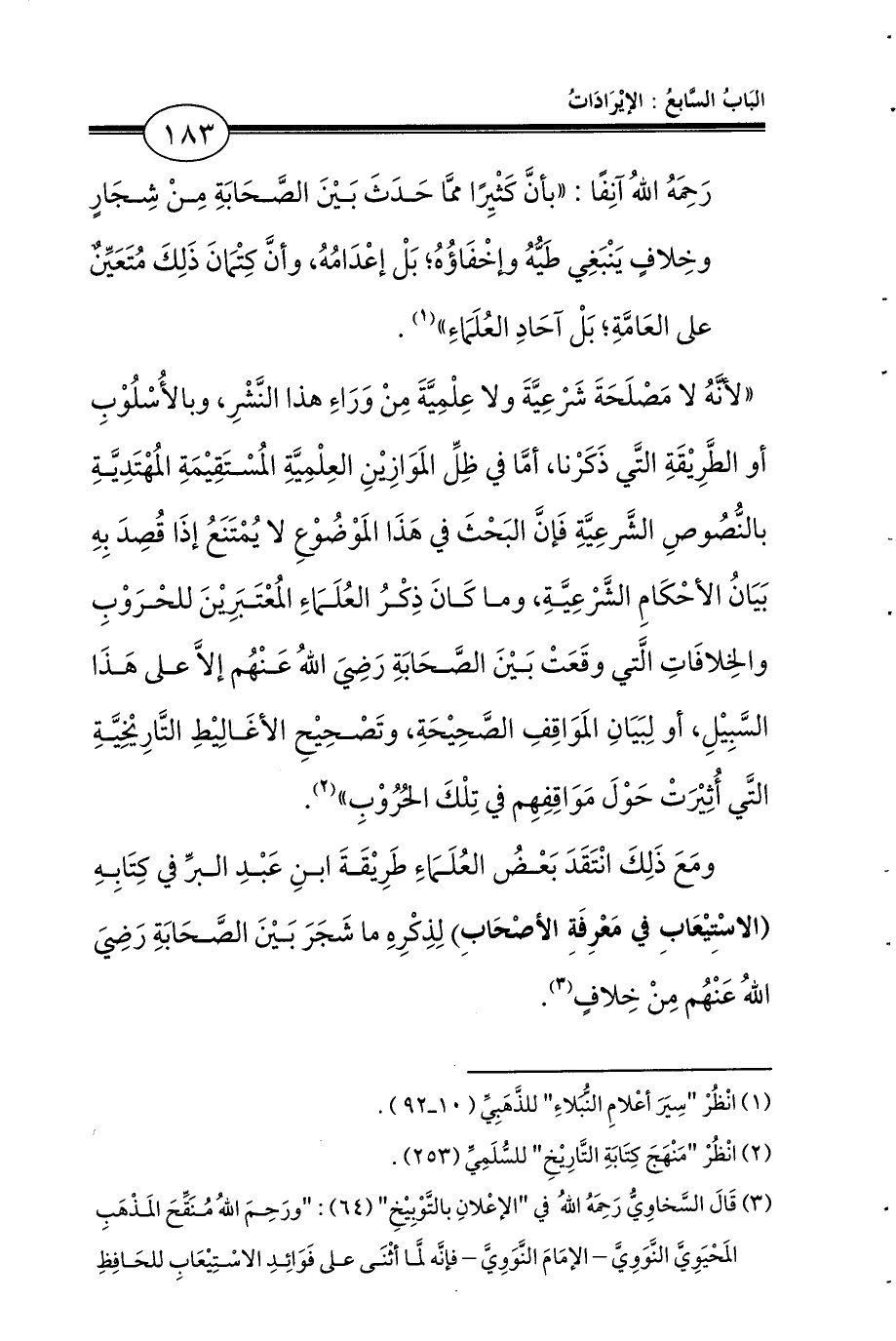 «لأنَّهُ لا مَصْلَحَةَ شَرْعِيَّةَ ولا عِلْمِيَّةَ مِنْ وَرَاءِ هذا النَّشْرِ، وبالأُسْلُوْبِ أو الطَّرِيْقَةِ التَّي ذَكَرْنا، أمَّا في ظِلِّ المَوَازِيْنِ العِلْمِيَّةِ المُسْتَقِيْمَةِ المُهْتَدِيَّةِ بالنُّصُوصِ الشَّرعِيَّةِ فَإنَّ البَحْثَ في هَذَا المَوْضُوْعِ لا يُمْتَنَعُ إذَا قُصِدَ بِهِ بَيَانُ الأحْكَامِ الشَّرْعِيَّةِ، وما كَانَ ذِكْرُ العُلَمَاءِ المُعْتَبَرِيْنَ للحْرَوْبِ والخِلافَاتِ الَّتي وقَعَتْ بَيْنَ الصَّحَابَةِ رَضِيَ اللهُ عَنْهُم إلاَّ على هَذَا السَّبِيْلِ، أو لِبَيَانِ المَوَاقِفِ الصَّحِيْحَةِ، وتَصْحِيْحِ الأغَالِيْطِ التَّارِيْخِيَّةِ التَّي أُثِيْرَتْ حَوْلَ مَوَاقِفِهِم في تِلْكَ الحُرُوْبِ» (¬2).