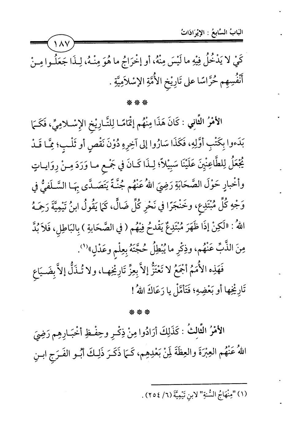 الأمْرُ الثَّانِي: كَانَ هَذَا مِنْهُم إتْمَامًا لِلتَّارِيْخِ الإِسْلامِيِّ، فَكَمَا بَدَءوا بِكَتْبِ أوَّلِهِ، فَكَذَا سَارُوا إلى آخِرِهِ دُوْنَ نَقْصٍ أو ثَلْبٍ؛ مِمَّا قَدْ يُجْعَلُ لِلطَّاعِنْيِنَ عَلَيْنَا سَبِيْلاً؛ لِذَا كَانَ في جَمْعِ ما وَرَدَ مِنْ رِوَاياتٍ وأخْبارٍ حَوْلَ الصَّحَابَةِ رَضِيَ اللهُ عَنْهُم جُنَّةً يَتَصَدَّى بِهَا السَّلَفيُّ في وَجْهِ كُلِّ مُبْتَدِعٍ، وخَنْجَرًا في نَحْرِ كُلِّ ضَالٍّ، كَمَا يَقُولُ ابنُ تَيْمِيَّةَ رَحِمَهُ اللهُ: «لَكِنْ إذَا ظَهَرَ مُبْتَدِعٌ يَقْدحُ فِيْهُم (في الصَّحَابةِ) بِالبَاطِلِ، فَلاَ بُدَّ مِنَ الذَّبِّ عَنْهُم، وذِكْرِ ما يُبْطِلُ حُجَّتَهُ بِعِلْمٍ وعَدْلٍ» (¬1).
