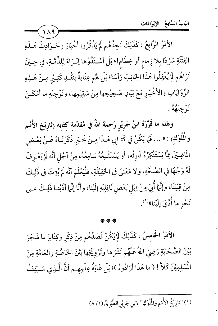 وهَذا ما قَرَّرَهُ ابنُ جَرِيْرٍ رَحِمَهُ اللهُ في مُقدِّمةِ كِتَابِه (تَارِيْخِ الأُمُمِ والمُلُوْكِ): «... فَمَا يَكُنْ في كَتابِي هَذَا مِنْ خَبَرٍ ذَكَرْنَاهُ عَنْ بَعْضِ المَاضِيْنَ مِمَّا يَسْتَنْكِرُهُ قَارِئُه، أو يَسْتَشْنِعُهُ سَامِعُهُ، مِنْ أجْلِ أنَّه لَمْ يَعْرِفْ لَهُ وَجْهًا في الصِّحَّةِ، ولا مَعْنىً في الحَقِيْقَةِ، فلْيَعْلَمْ أنَّه لَمْ يُؤتَ في ذَلِكَ مِنْ قِبَلِنَا، وإنَّمَا أُتِيَ مِنْ قِبَلِ بَعْضِ نَاقِلِيْهِ إلَيْنا، وأنَّا إنِّما أدَّيْنا ذَلِكَ على نَحْوِ ما أُدِّيَ إلَيْنا» (¬1).