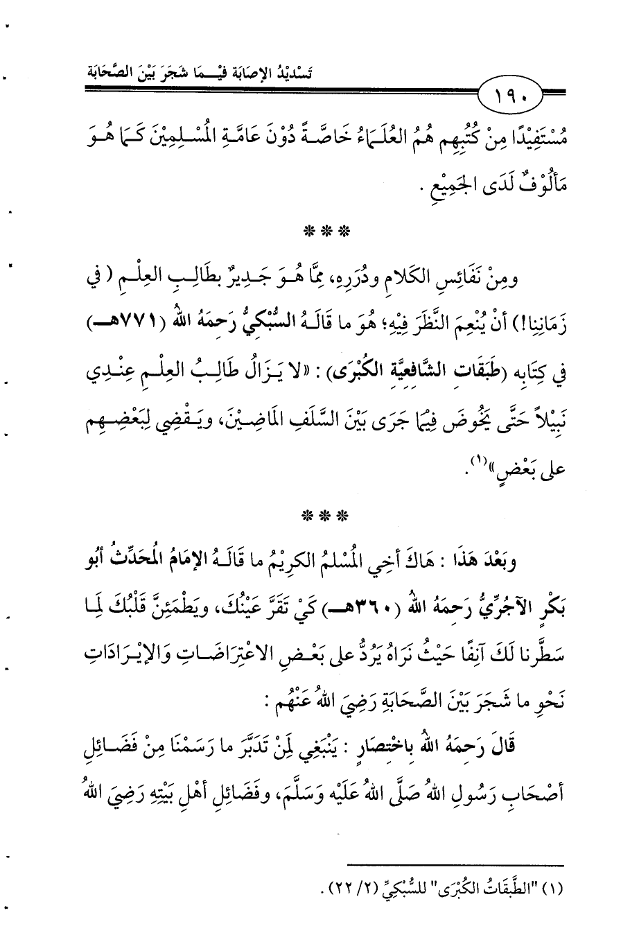 ومِنْ نَفَائِسِ الكَلامِ ودُرَرِهِ، مِمَّا هُوَ جَدِيرٌ بطَالِبِ العِلْمِ (في زَمَانِنِا!) أنْ يُنْعِمَ النَّظَرَ فِيْهِ؛ هُوَ ما قَالَهُ السُّبْكِيُّ رَحِمَهُ اللهُ (771) في كِتَابِه (طَبَقَاتِ الشَّافِعِيَّةِ الكُبْرَى): «لا يَزَالُ طَالِبُ العِلْمِ عِنْدِي نَبِيْلاً حَتَّى يَخُوضَ فِيْمَا جَرَى بَيْنَ السَّلَفِ المَاضِيْنَ، ويَقْضِي لِبَعْضِهِم على بَعْضٍ» (¬1).