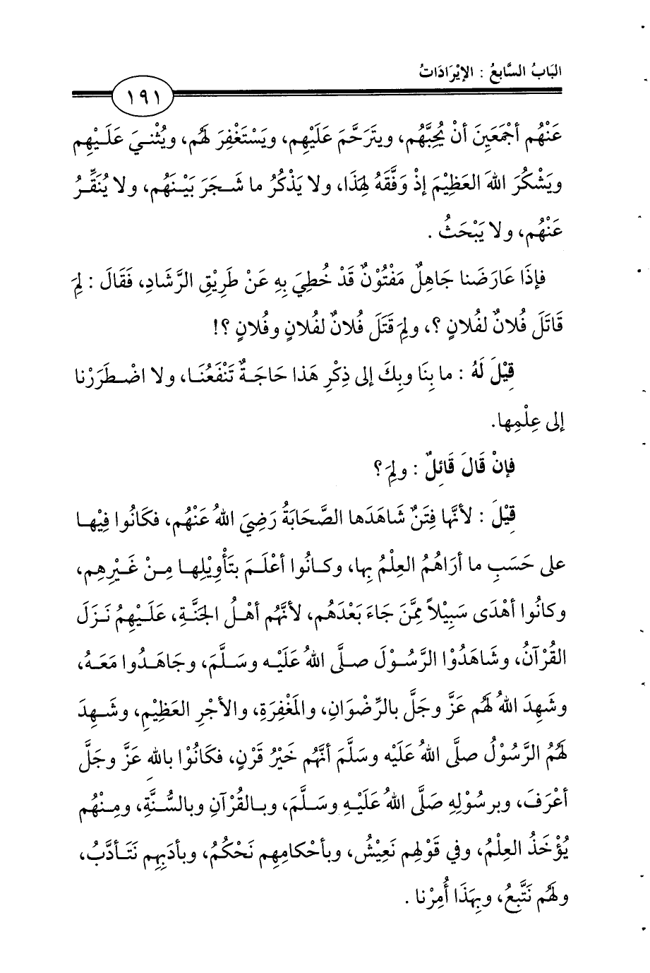 عَنْهُم أجْمَعَيِنَ أنْ يُحِبَّهُم، ويتَرَحَّمَ عَلَيْهِم، ويَسْتَغْفِرَ لَهُم، ويُثْنيَ عَلَيْهِم ويَشْكُرَ اللهَ العَظِيْمَ إذْ وَفَّقَهُ لِهَذَا، ولا يَذْكُرُ ما شَجَرَ بَيْنَهُم، ولا يُنَقِّرُ عَنْهُم، ولا يَبْحَثُ.