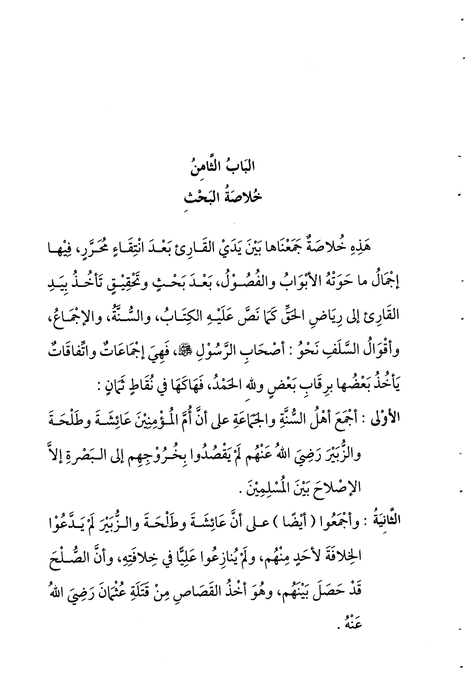 هَذِهِ خُلاصَةٌ جَمَعْنَاها بَيْنَ يَدَيْ القَارِئ بَعْدَ انْتِقَاءٍ مُحَرَّرٍ، فِيْها إجْمَالُ ما حَوَتْهُ الأبْوَابُ والفُصُوْلُ، بَعْدَ بَحْثٍ وتَحْقِيْقٍ تَأخُذُ بِيَدِ القَارِئ إلى رِيَاضِ الحَقِّ كَمَا نَصَّ عَلَيْهِ الكِتَابُ، والسُّنَّةُ، والإجْمَاعُ، وأقْوَالُ السَّلَفِ نَحْوُ: أصْحَابِ الرَّسُوْلِ - صلى الله عليه وسلم -، فَهِيَ إجْمَاعَاتٌ واتِّفاقَاتٌ يَأخُذُ بَعْضُها برِقَابِ بَعْضٍ وللهِ الحَمْدُ، فَهَاكَهَا في نُقَاطٍ ثَمَانٍ: