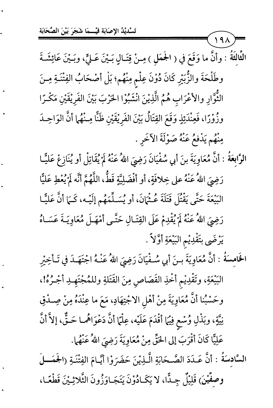 الرَّابِعَةُ: أنَّ مُعَاوِيَةَ بنَ أبي سُفْيَانَ رَضِيَ اللهُ عَنْهُ لَمْ يُقَاتِلْ أو يُنَازِعْ عَليًّا رَضِيَ اللهُ عَنْهُ على خِلافَةٍ، أو أفْضَلِيَّةٍ قَطُّ، اللَّهُمَّ أنَّه لَمْ يُعْطِ عَليًّا البَيْعَةَ حَتَّى يَقْتُلَ قَتَلَةَ عُثْمَانَ، أو يُسَلِّمَهُم إلَيْه، كَمَا أنَّ عَليًّا رَضِيَ اللهُ عَنْهُ لَمْ يُقْدِمْ عَلَى القِتَالِ حَتَّى أمْهَلَ مُعَاوِيَةَ عَسَاهُ يَرْضَى بتَقْدِيْمِ البَيْعَةِ أوَّلاً.